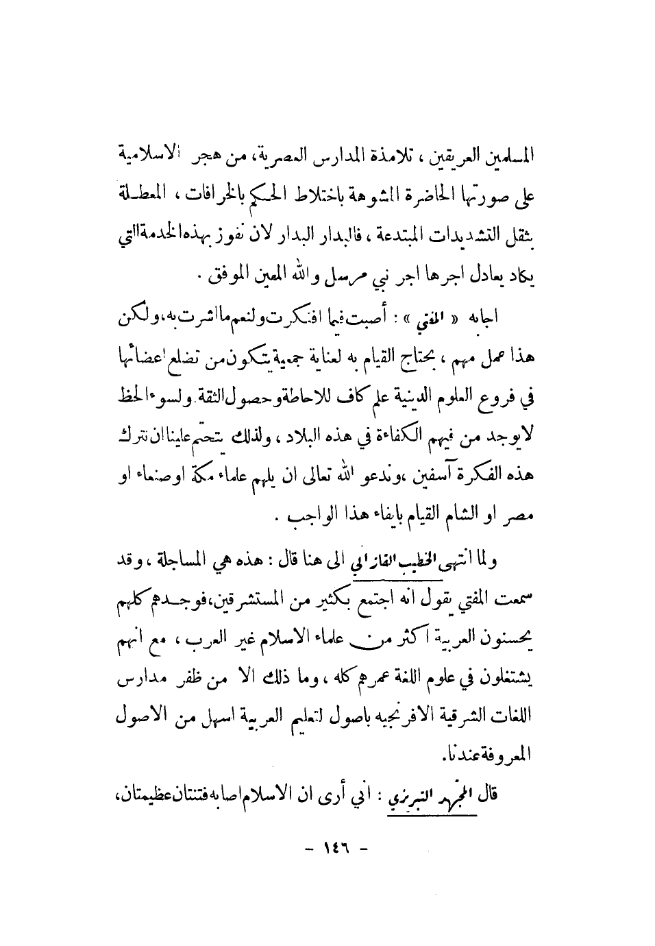 الْمُسلمين العريقين، تلامذة الْمدَارِس المصرية، من هجر الإسلامية على صورتهَا الْحَاضِرَة المشوهة باختلاط الحكم بالخرافات، المعطلة بثقل التشديدات المبتدعة، فالبدار البدار لِأَن نفوز بِهَذِهِ الْخدمَة الَّتِي يكَاد يعادل أجرهَا أجر نَبِي مُرْسل وَالله الْمعِين الْمُوفق.