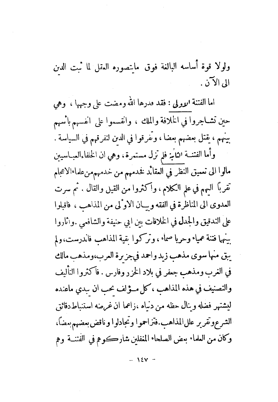 وَأما الْفِتْنَة الثَّانِيَة فَلم تزل مستمرة، وَهِي أَن الْخُلَفَاء العباسيين مالوا إِلَى تعميق النّظر فِي العقائد فخدمهم من خدمهم من عُلَمَاء الإعجام تقرباً إِلَيْهِم فِي علم الْكَلَام، وَأَكْثرُوا من القيل والقال. ثمَّ سرت الْعَدْوى إِلَى المناظرة فِي الْفِقْه وَبَيَان الأولى من الْمذَاهب، فاقبلوا على التدقيق والجدل فِي الخلافات بَين أبي حنيفَة وَالشَّافِعِيّ. وأثاروا بَينهمَا فتْنَة عمياء وحربا صماء، وَتركُوا بَقِيَّة الْمذَاهب فاندرست، وَلم يبْق مِنْهَا سوى مَذْهَب زيد وَاحْمَدْ فِي جَزِيرَة الْعَرَب، وَمذهب مَالك فِي الغرب وَمذهب جَعْفَر فِي بِلَاد الخزر وَفَارِس. فاكثروا التَّأْلِيف والتصنيف فِي هَذِه الْمذَاهب، كل مؤلف يحب أَن يُبْدِي مَا عِنْده ليشتهر فَضله وينال حَظه من دُنْيَاهُ، زاعما أَن غَرَضه استنباط دقائق الشَّرْع وَتَقْرِير علل الْمذَاهب. فتزاحموا وتجادلوا وناقض بَعضهم بَعْضًا، وَكَانَ من الْعلمَاء بعض الصلحاء المغفلين شاركوهم فِي الْفِتْنَة وهم