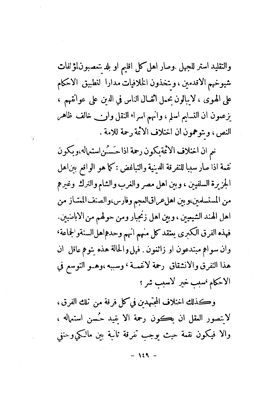 والتقليد اسْتُرْ للْجَهْل. وَصَارَ أهل كل إقليم أَو بلد يتعصبون لمؤلفات شيوخهم الأقدمين، ويتخذون الخلافيات مدارا لتطبيق الْأَحْكَام على الْهوى، لَا يبالون بِحمْل أثقال النَّاس فِي الدّين على عواتقهم، يَزْعمُونَ أَن التَّسْلِيم أسلم، وَأَنَّهُمْ إسراء النَّقْل وان خَالف ظَاهر النَّص، ويتوهمون أَن اخْتِلَاف الْأَئِمَّة رَحْمَة للْأمة.