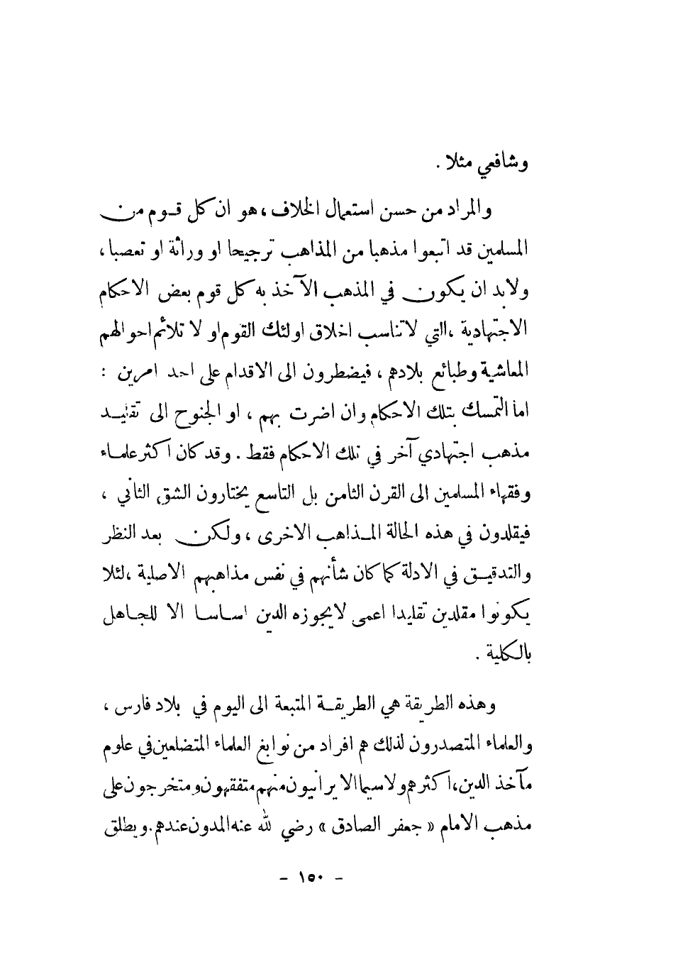 وَهَذِه الطَّرِيقَة هِيَ الطَّرِيقَة المتبعة إِلَى الْيَوْم فِي بِلَاد فَارس، وَالْعُلَمَاء المتصدرون لذَلِك هم أَفْرَاد من نوابغ الْعلمَاء المتضلعين فِي عُلُوم مآخذ الدّين، أَكْثَرهم وَلَا سِيمَا الإيرانيون مِنْهُم متفقهون ومتخرجون على مَذْهَب الإِمَام " جَعْفَر الصَّادِق " رَضِي لله عَنهُ المدون عِنْدهم. وَيُطلق