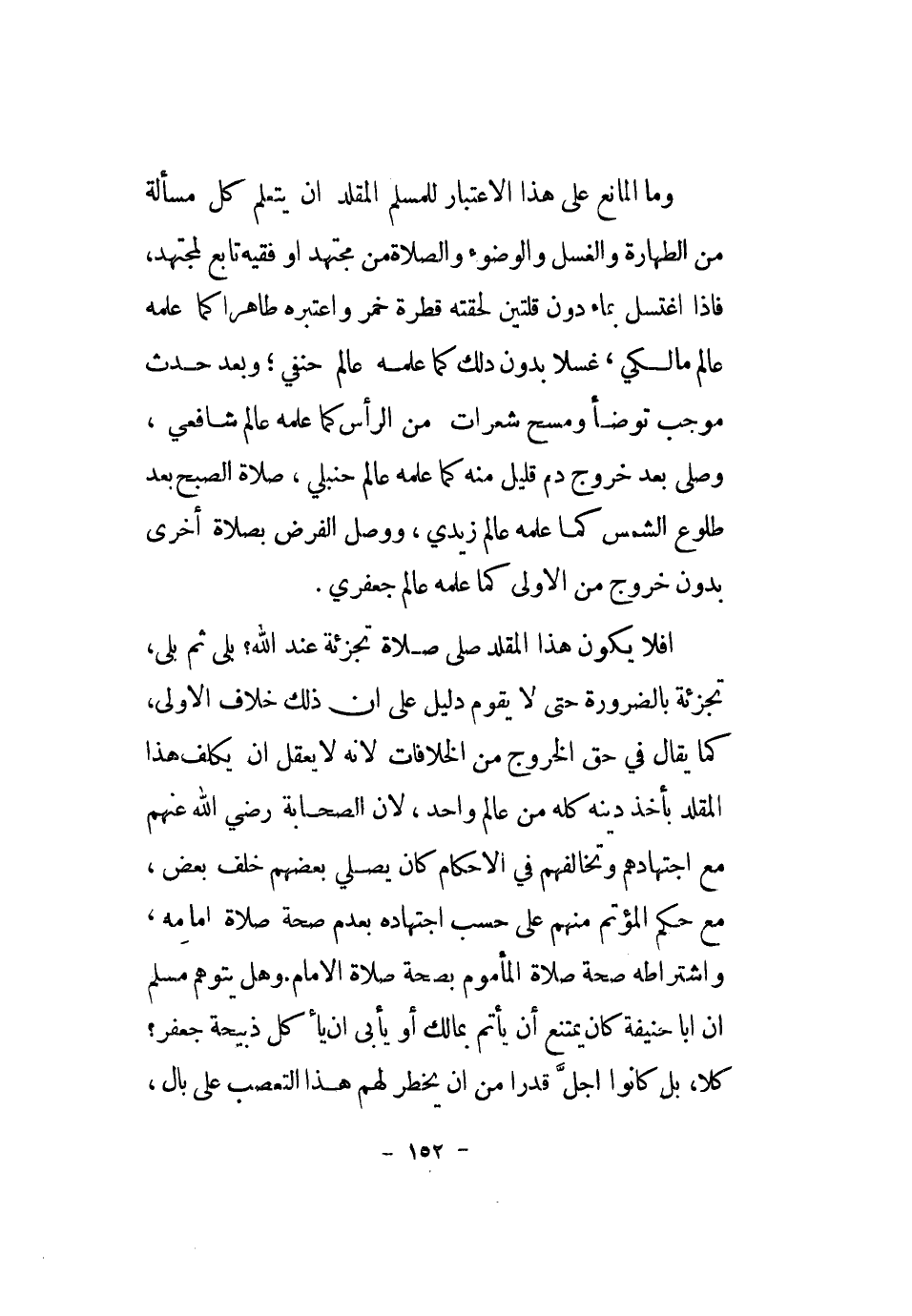 وَمَا الْمَانِع على هَذَا الِاعْتِبَار للْمُسلمِ الْمُقَلّد أَن يتَعَلَّم كل مَسْأَلَة من الطَّهَارَة وَالْغسْل وَالْوُضُوء وَالصَّلَاة من مُجْتَهد أَو فَقِيه تَابع لمجتهد، فَإِذا اغْتسل بِمَاء دون قُلَّتَيْنِ لحقته قَطْرَة خمر واعتبره طَاهِرا كَمَا علمه عَالم مالكي، غسلا بِدُونِ دلك كَمَا علمه عَالم حَنَفِيّ؛ وَبعد حدث مُوجب تَوَضَّأ وَمسح شَعرَات من الرَّأْس كَمَا علمه عَالم شَافِعِيّ، وَصلى بعد خُرُوج دم قَلِيل مِنْهُ كَمَا علمه عَالم حنبلي، صَلَاة الصُّبْح بعد طُلُوع الشَّمْس كَمَا علمه عَالم زيدي، وَوصل الْفَرْض بِصَلَاة أُخْرَى بِدُونِ خُرُوج من الأولى كَمَا علمه عَالم جعفري.
