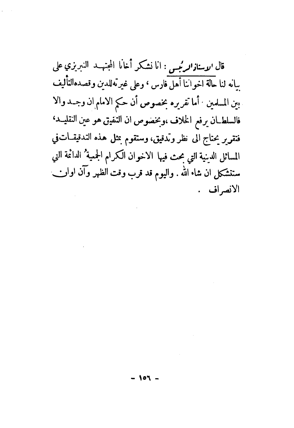 قَالَ الْأُسْتَاذ الرئيس: أَنا نشكر أخانا الْمُجْتَهد التبريزي على بَيَانه لنا حَالَة إِخْوَاننَا أهل فَارس، وعَلى غيرته للدّين وقصده التَّأْلِيف بَين الْمُسلمين. أما تَقْرِيره بِخُصُوص أَن حكم الإِمَام إِن وجد وَإِلَّا فالسلطان يرفع الْخلاف، وبخصوص أَن التلفيق هُوَ عين التَّقْلِيد، فتقرير يحْتَاج إِلَى نظر وتدقيق، وستقوم بِمثل هَذِه التدقيقات فِي الْمسَائِل الدِّينِيَّة الَّتِي بحث فِيهَا الإخوان الْكِرَام الجمعية الدائمة الَّتِي ستتشكل إِن شَاءَ الله. وَالْيَوْم قد قرب وَقت الظّهْر وآن أَوَان الِانْصِرَاف.