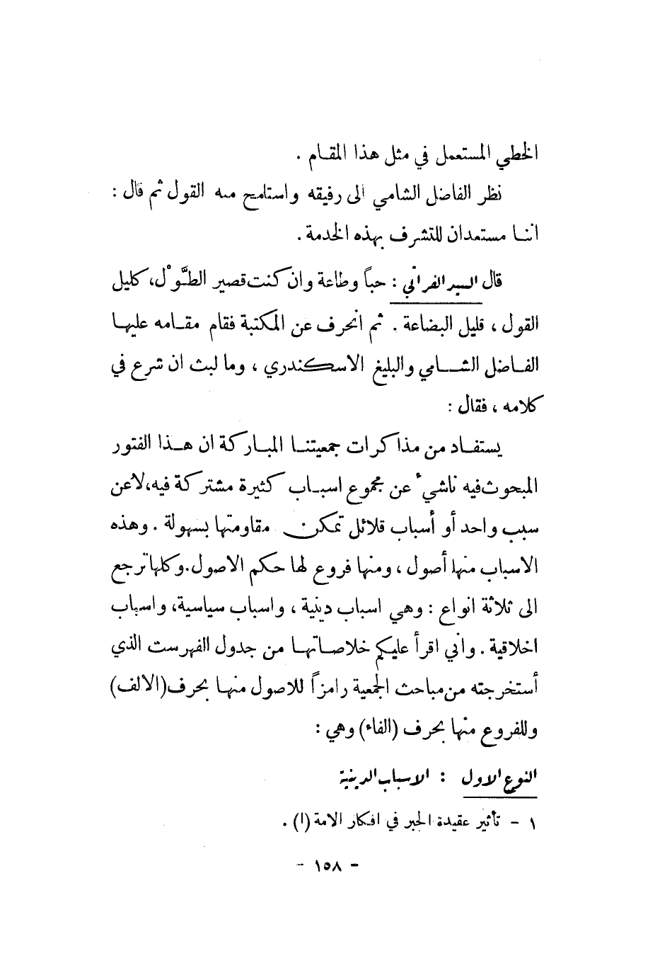 يُسْتَفَاد من مذاكرات جمعيتنا الْمُبَارَكَة أَن هَذَا الفتور المبحوث فِيهِ ناشيء عَن مَجْمُوع أَسبَاب كَثِيرَة مُشْتَركَة فِيهِ، لَا عَن سَبَب وَاحِد أَو أَسبَاب قَلَائِل تمكن مقاومتها بسهولة. وَهَذِه الْأَسْبَاب مِنْهَا أصُول، وَمِنْهَا فروع لَهَا حكم الْأُصُول. وَكلهَا ترجع إِلَى ثَلَاثَة أَنْوَاع: وَهِي أَسبَاب دينية، وَأَسْبَاب سياسية، وَأَسْبَاب أخلاقية. وَإِنِّي أَقرَأ عَلَيْكُم خلاصاتها من جدول الفهرست الَّذِي استخرجته من مبَاحث الجمعية رامزاً لِلْأُصُولِ مِنْهَا بِحرف (الْألف) وللفروع مِنْهَا بِحرف (الْفَاء) وَهِي: