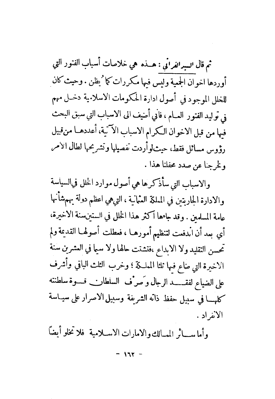 والأسباب الَّتِي سأذكرها هِيَ أصُول موارد الْخلَل فِي السياسة والإدارة الجاريتين فِي المملكة العثمانية، الَّتِي هِيَ أعظم دولة يهم شَأْنهَا عَامَّة الْمُسلمين. وَقد جاءها اكثر هَذَا الْخلَل فِي السِّتين سنة الْأَخِيرَة، أَي بعد أَن اندفعت لتنظيم أمورها، فعطلت أُصُولهَا الْقَدِيمَة وَلم تحسن التَّقْلِيد وَلَا الإبداع، فتشتت حَالهَا وَلَا سِيمَا فِي الْعشْرين سنة الْأَخِيرَة الَّتِي ضَاعَ فِيهَا ثلثا المملكة؛ وَخرب الثُّلُث الْبَاقِي وأشرف على الضّيَاع لفقد الرِّجَال وَصرف السُّلْطَان قُوَّة سلطنته كلهَا فِي سَبِيل حفظ ذَاته الشَّرِيفَة وسبيل الْإِصْرَار على سياسة الِانْفِرَاد.