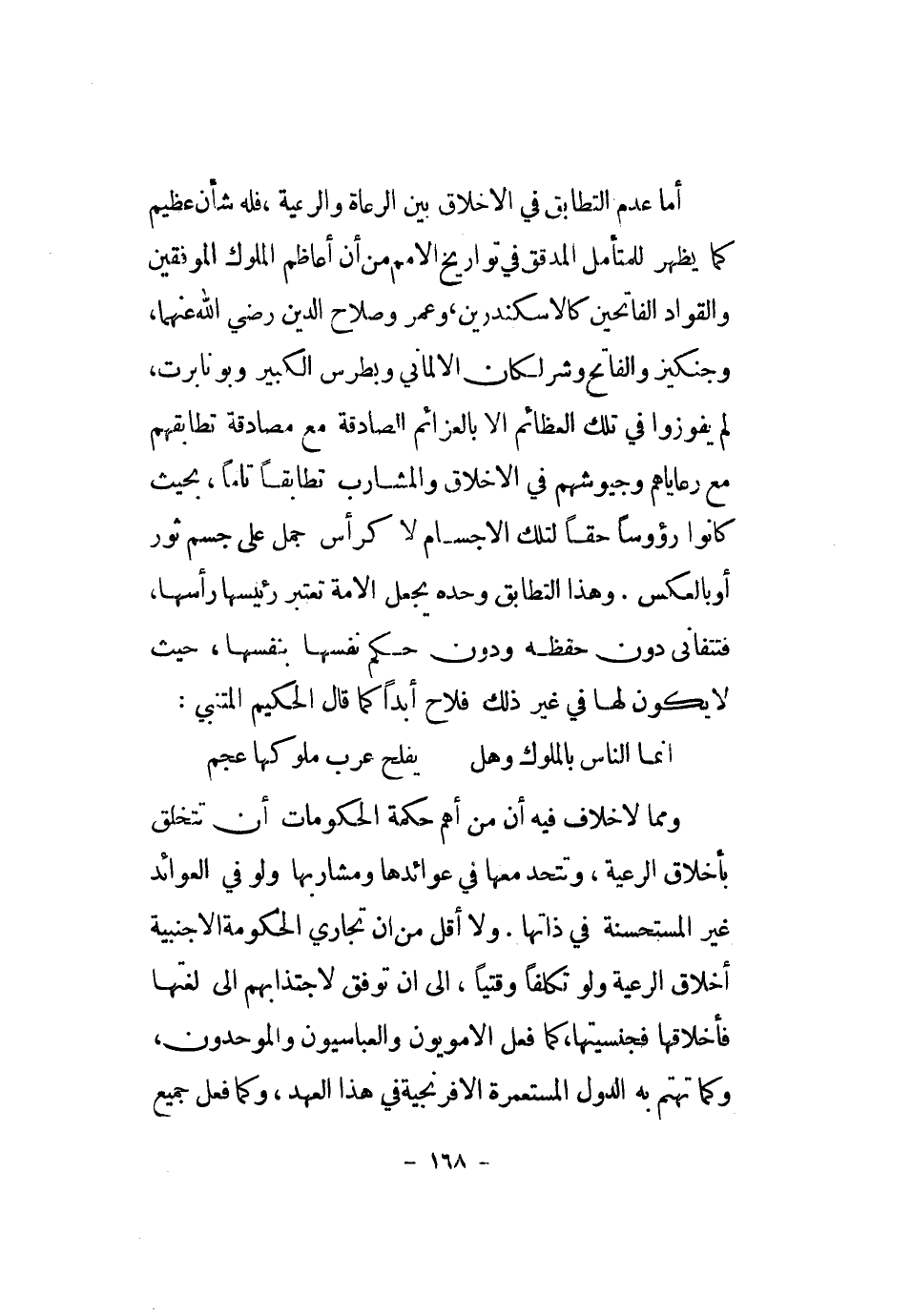 أما عدم التطابق فِي الْأَخْلَاق بَين الرُّعَاة والرعية، فَلهُ شان عَظِيم كَمَا يظْهر للمتأمل المدقق فِي تواريخ الْأُمَم من أَن أعاظم الْمُلُوك الموفقين والقواد الفاتحين كالإسكندرين، وَعمر وَصَلَاح الدّين رَضِي الله عَنْهُمَا، وجنكيز والفاتح وشرلكان الألماني وبطرس الْكَبِير وبونابرت، لم يفوزوا فِي تِلْكَ العظائم إِلَّا بالعزائم الصادقة مَعَ مصادقة تطابقهم مَعَ رعاياهم وجيوشهم فِي الْأَخْلَاق والمشارب تطابقاً تَاما، بِحَيْثُ كَانُوا رؤوساً حَقًا لتِلْك الْأَجْسَام لَا كرأس جمل على جسم ثَوْر أَو بِالْعَكْسِ. وَهَذَا التطابق وَحده يَجْعَل الْأمة تعْتَبر رئيسها رَأسهَا، فتتفانى دون حفظه وَدون حكم نَفسهَا بِنَفسِهَا، حَيْثُ لَا يكون لَهَا فِي غير ذَلِك فلاح أبدا كَمَا قَالَ الْحَكِيم المتنبي: