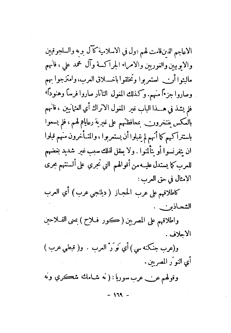 الْأَعَاجِم الَّذين قَامَت لَهُم دوَل فِي الإسلامية كآل بويه والسلجوقيين والأيوبيين والغوريين والأمراء الجراكسة وَآل مُحَمَّد عَليّ، فَإِنَّهُم مَا لَبِثُوا أَن استعربوا وتخلقوا بأخلاق الْعَرَب، وامتزجوا بهم وصاروا جُزْءا مِنْهُم. وَكَذَلِكَ المغول التاتار صَارُوا فرسا وهنوداً، فَلم يشذ فِي هَذَا الْبَاب غير المغول الأتراك أَي العثمانيين، فَإِنَّهُم بِالْعَكْسِ يفتخرون بمحافظتهم على غيرية رعاياهم لَهُم، فَلم يسعوا باستتراكهم كَمَا أَنهم لم يقبلُوا أَن يستعربوا، والمتأخرون مِنْهُم قبلوا أَن يتفرنسوا أَو يتألمنوا. وَلَا يعقل لذَلِك سَبَب غير شَدِيد بغضهم للْعَرَب كَمَا يسْتَدلّ عَلَيْهِ من أَقْوَالهم الَّتِي تجْرِي على ألسنتهم مجْرى الْأَمْثَال فِي حق الْعَرَب:
