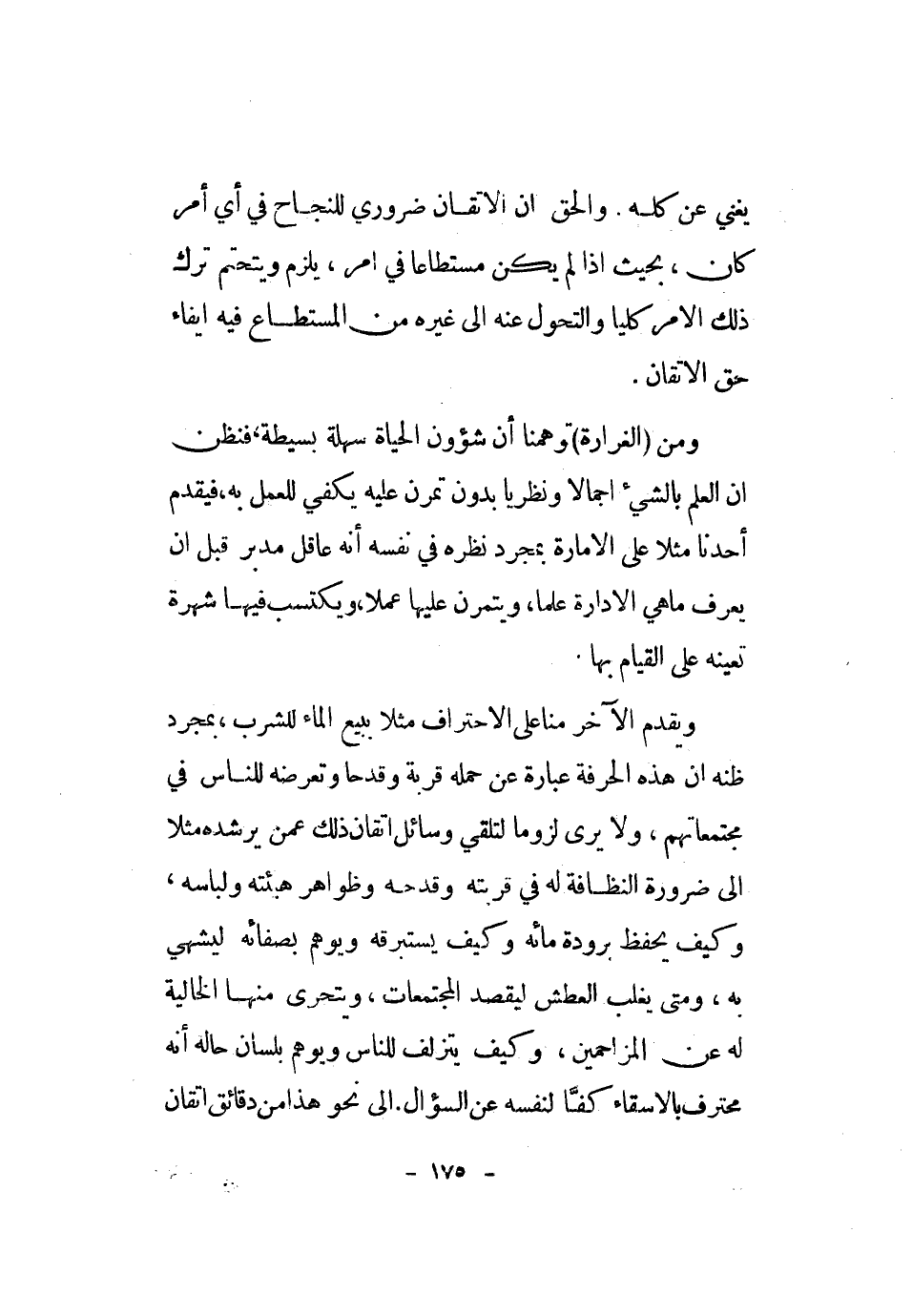 وَيقدم الآخر منا على الاحتراف مثلا بِبيع المَاء للشُّرْب، بِمُجَرَّد ظَنّه أَن هَذِه الحرفة عبارَة عَن حَملَة قربَة وَقَدحًا وتعرضه للنَّاس فِي مجتمعاتهم، وَلَا يرى لُزُوما لتقلي وَسَائِل إتقان ذَلِك عَمَّن يرشده مثلا إِلَى ضَرُورَة النَّظَافَة لَهُ فِي قربته وقدحه وظواهر هَيئته ولباسه، وَكَيف يحفظ برودة مائَة وَكَيف يستبرقه ويوهم بصفائه ليشهى بِهِ، وَمَتى يغلب الْعَطش ليقصد المجتمعات، ويتحرى مِنْهَا الخالية لَهُ عَن المزاحمين، وَكَيف يتزلف للنَّاس ويوهم بِلِسَان حَالَة انه محترف بالاسقاء كفا لنَفسِهِ عَن السُّؤَال. إِلَى نَحْو هَذَا من دقائق إتقان