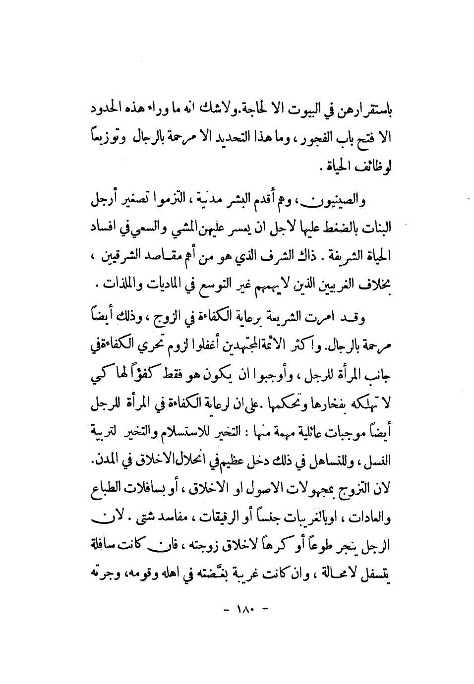 باستقرارهن فِي الْبيُوت إِلَّا لحَاجَة. وَلَا شكّ أَنه مَا وَرَاء هَذِه الْحُدُود إِلَّا فتح بَاب الْفُجُور، وَمَا هَذَا التَّحْدِيد إِلَّا مرحمة بِالرِّجَالِ وتوزيعاً لوظائف الْحَيَاة.