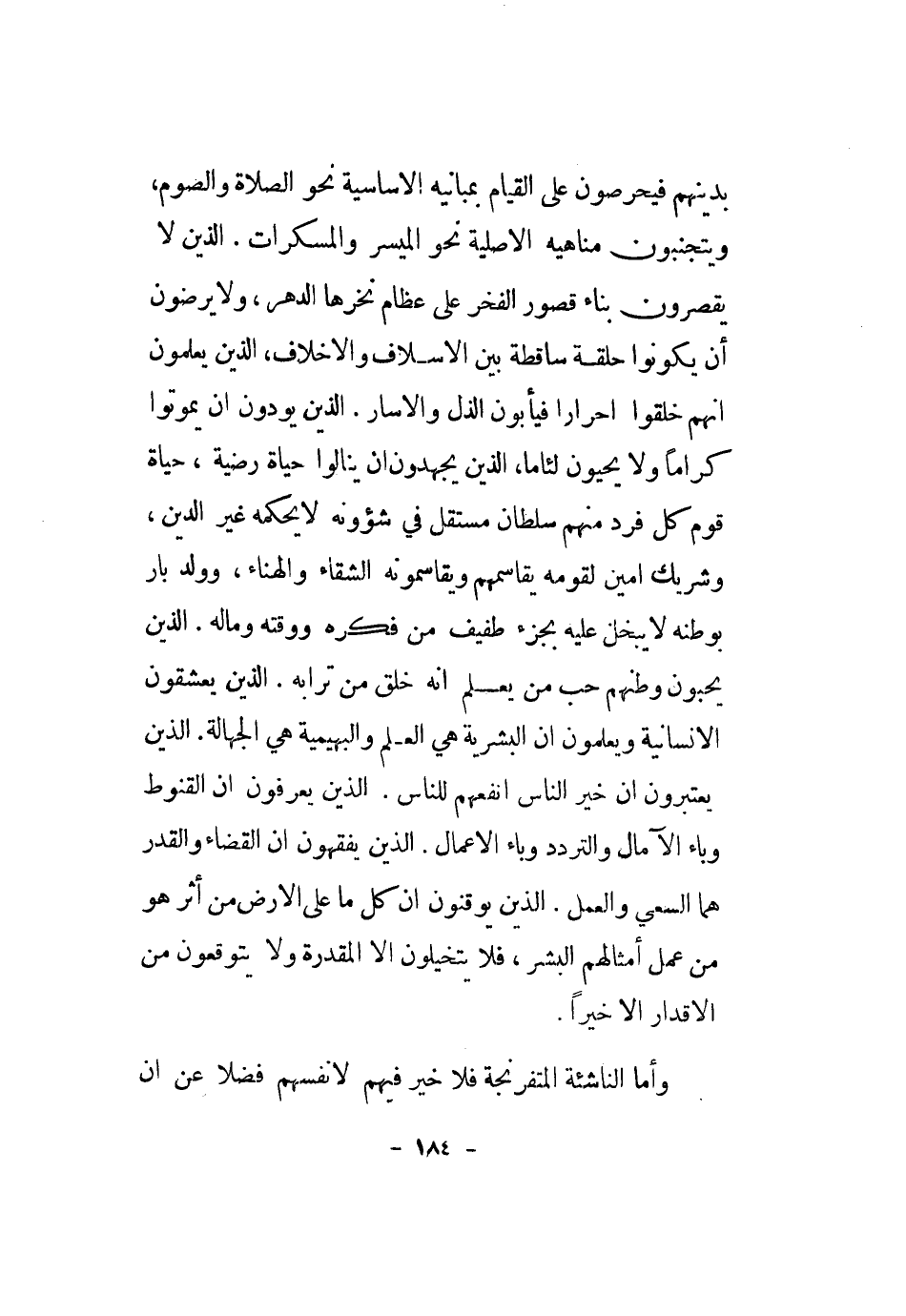 بدينهم فيحرصون على الْقيام بمبانيه الأساسية نَحْو الصَّلَاة وَالصَّوْم، ويتجنبون مناهيه الْأَصْلِيَّة نَحْو الميسر والمسكرات. الَّذين لَا يقصرون بِنَاء قُصُور الْفَخر على عِظَام نخرها الدَّهْر، وَلَا يرضون أَن يَكُونُوا حَلقَة سَاقِطَة بَين الأسلاف والإخلاف، الَّذين يعلمُونَ انهم خلقُوا أحراراً فيأبون الذل والأسار. الَّذين يودون أَن يموتوا كراماً وَلَا يحيون لِئَامًا، الَّذين يجهدون أَن ينالوا حَيَاة رضية، حَيَاة قوم كل فَرد مِنْهُم سُلْطَان مُسْتَقل فِي شؤونه لَا يحكمه غير الدّين، وَشريك أَمِين لِقَوْمِهِ يقاسمهم ويقاسمونه الشَّقَاء والهناء، وَولد بار بوطنه لَا يبخل عَلَيْهِ بِجُزْء طفيف من فكره وَوَقته وَمَاله. الَّذين يحبونَ وطنهم حب من يعلم أَنه خلق من ترابه. الَّذين يعشقون الإنسانية ويعلمون أَن البشرية هِيَ الْعلم والبهيمية هِيَ الْجَهَالَة. الَّذين يعتبرون أَن خير النَّاس أنفعهم للنَّاس. الَّذين يعْرفُونَ أَن الْقنُوط وباء الآمال والتردد وباء الْأَعْمَال. الَّذين يفقهُونَ أَن الْقَضَاء وَالْقدر هما السَّعْي وَالْعَمَل. الَّذين يوقنون أَن كل مَا على الأَرْض من أثر هُوَ من عمل أمثالهم الْبشر، فَلَا يتخيلون إِلَّا الْمقدرَة وَلَا يتوقعون من الأقدار إِلَّا خيرا.
