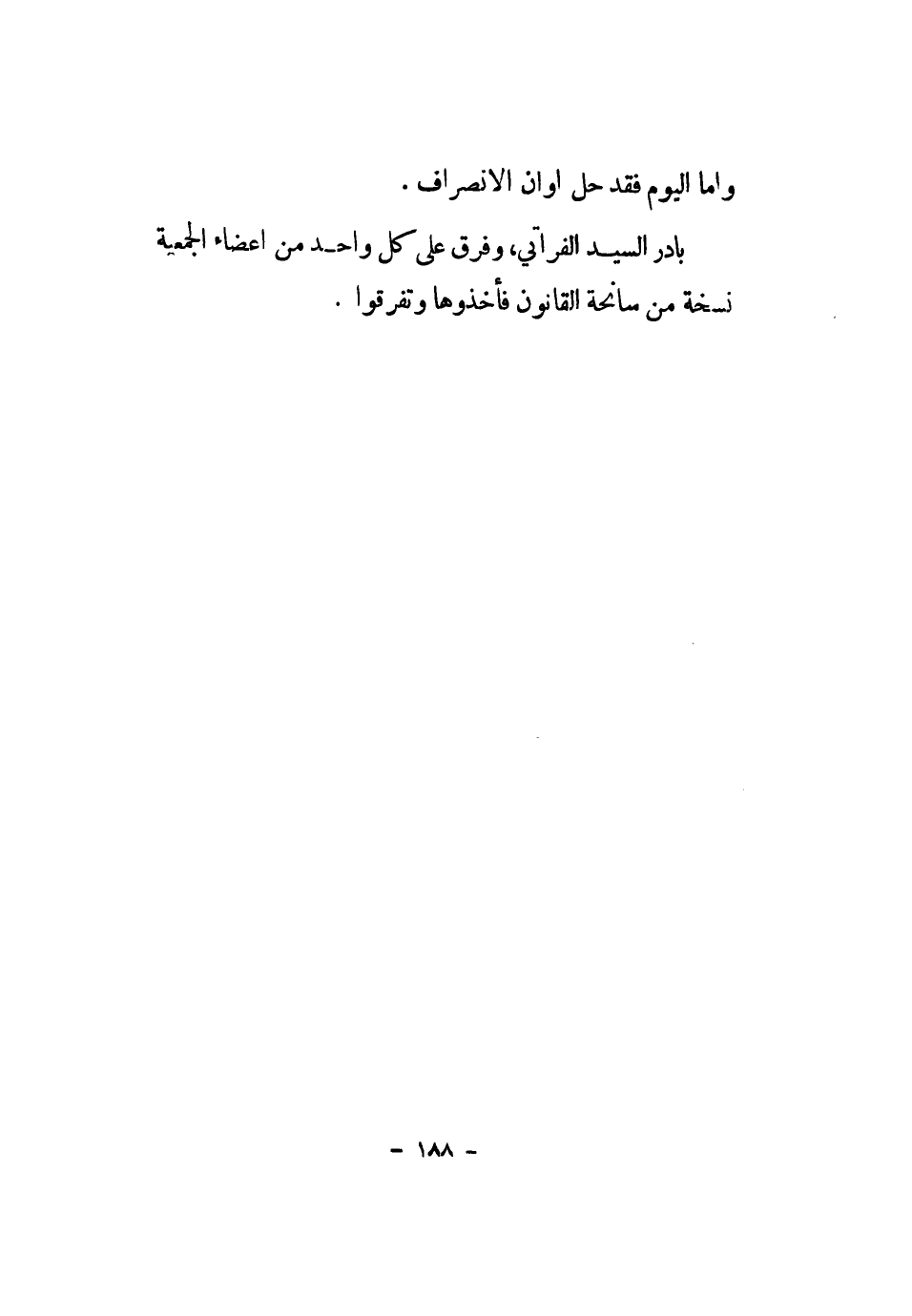 بَادر السَّيِّد الفراتي، وَفرق على كل وَاحِد من أَعْضَاء الجمعية نُسْخَة من سانحة القانون فَأَخَذُوهَا وَتَفَرَّقُوا.
