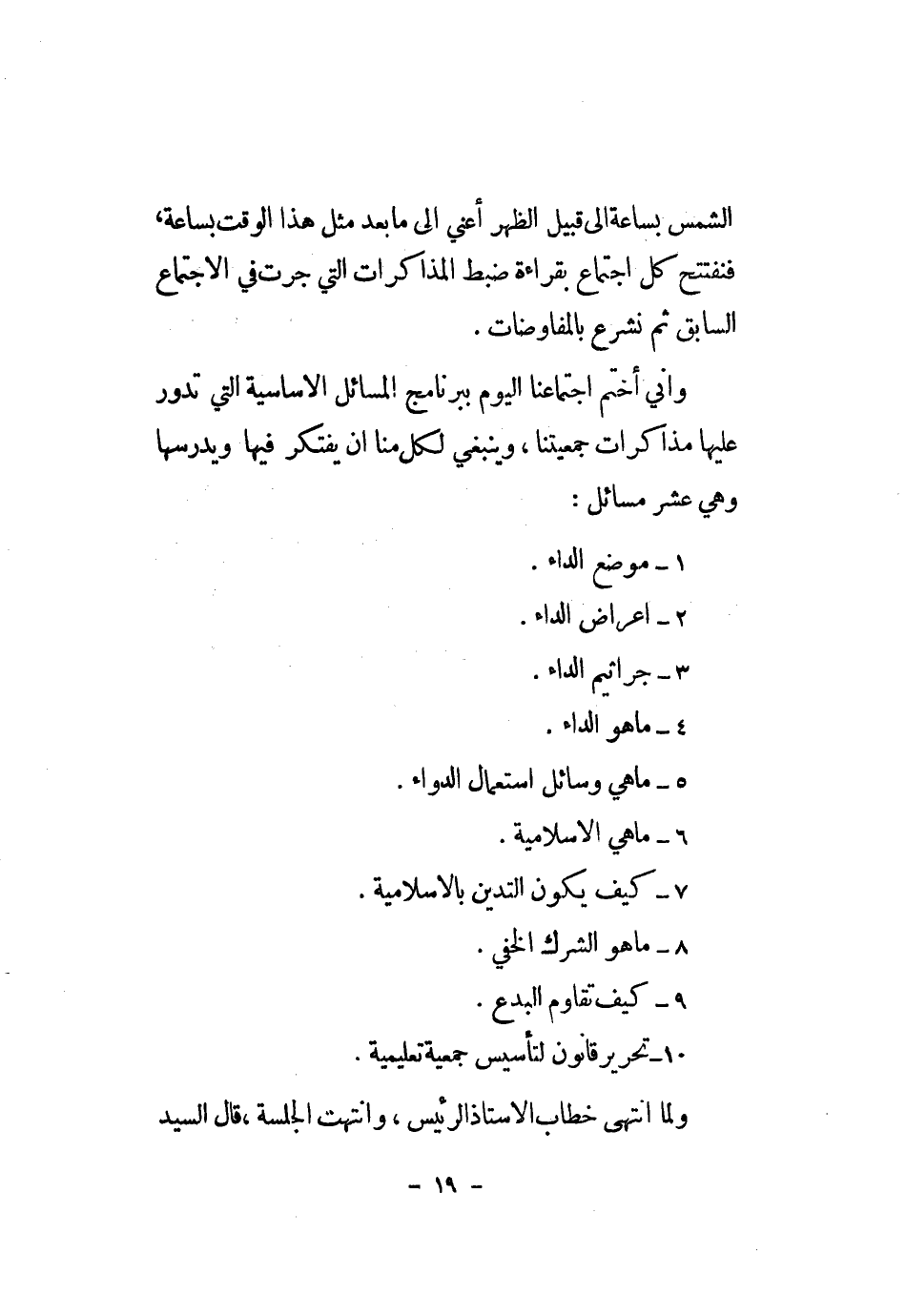 الشَّمْس بساعة إِلَى قبيل الظّهْر أَعنِي إِلَى مَا بعد مثل هَذَا الْوَقْت بساعة، فنفتتح كل اجْتِمَاع بِقِرَاءَة ضبط المذاكرات الَّتِي جرت فِي الِاجْتِمَاع السَّابِق ثمَّ نشرع بالمفاوضات. " وَإِنِّي أختم اجتماعنا الْيَوْم ببرنامج الْمسَائِل الأساسية الَّتِي تَدور عَلَيْهَا مذاكرات جمعيتنا، وَيَنْبَغِي لكل منا أَن يفتكر فِيهَا ويدرسها وَهِي عشر مسَائِل: