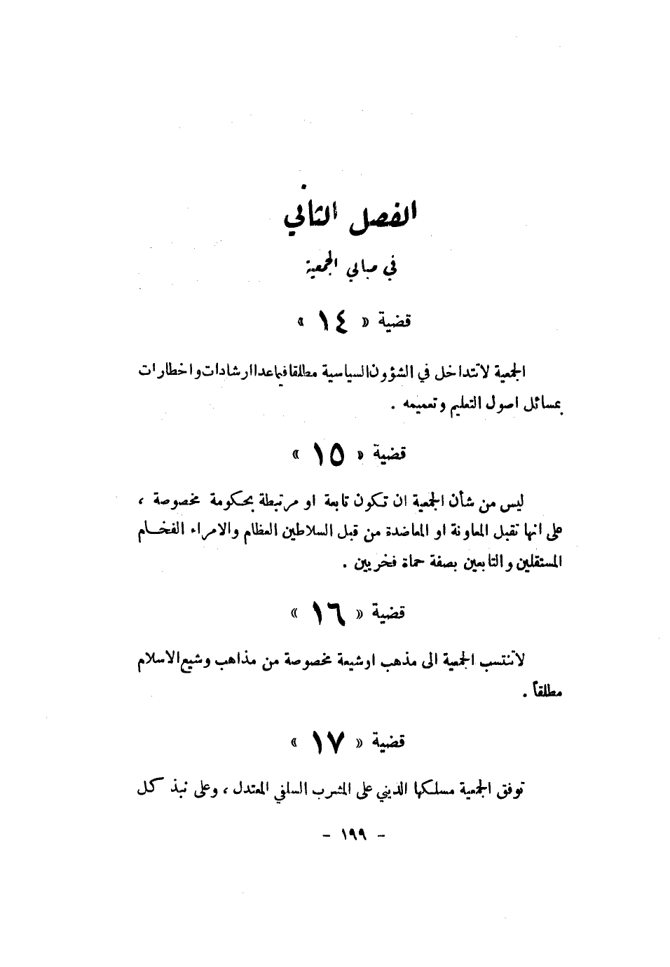 الجمعية لَا تتداخل فِي الشؤون السياسية مُطلقًا فِيمَا عدا إرشادات وإخطارات بمسائل أصُول التَّعْلِيم وتعميمه.