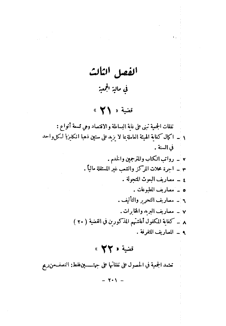 تعتمد الجمعية فِي الْحُصُول على نفقاتها على جِهَتَيْنِ فَقَط: النّصْف من ربح