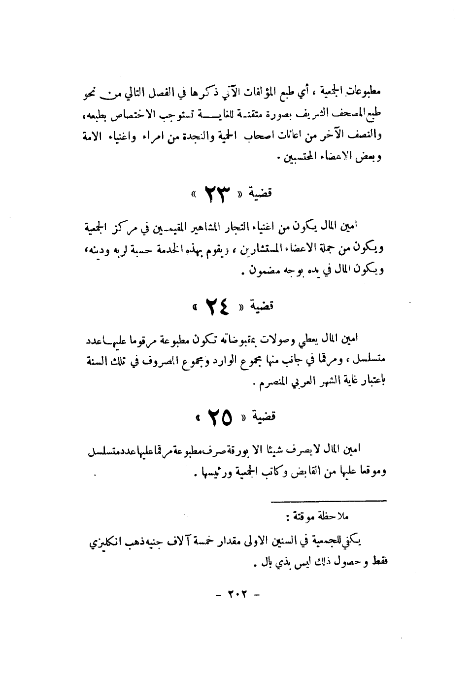 مطبوعات الجمعية، أَي طبع المؤلفات الْآتِي ذكرهَا فِي الْفَصْل التَّالِي من نَحْو طبع الْمُصحف الشريف بِصُورَة متقنة للغاية تستوجب الِاخْتِصَاص بطبعه، وَالنّصف الآخر من إعانات أَصْحَاب الحمية والنجدة من أُمَرَاء وأغنياء الْأمة وَبَعض الْأَعْضَاء المحتسبين.