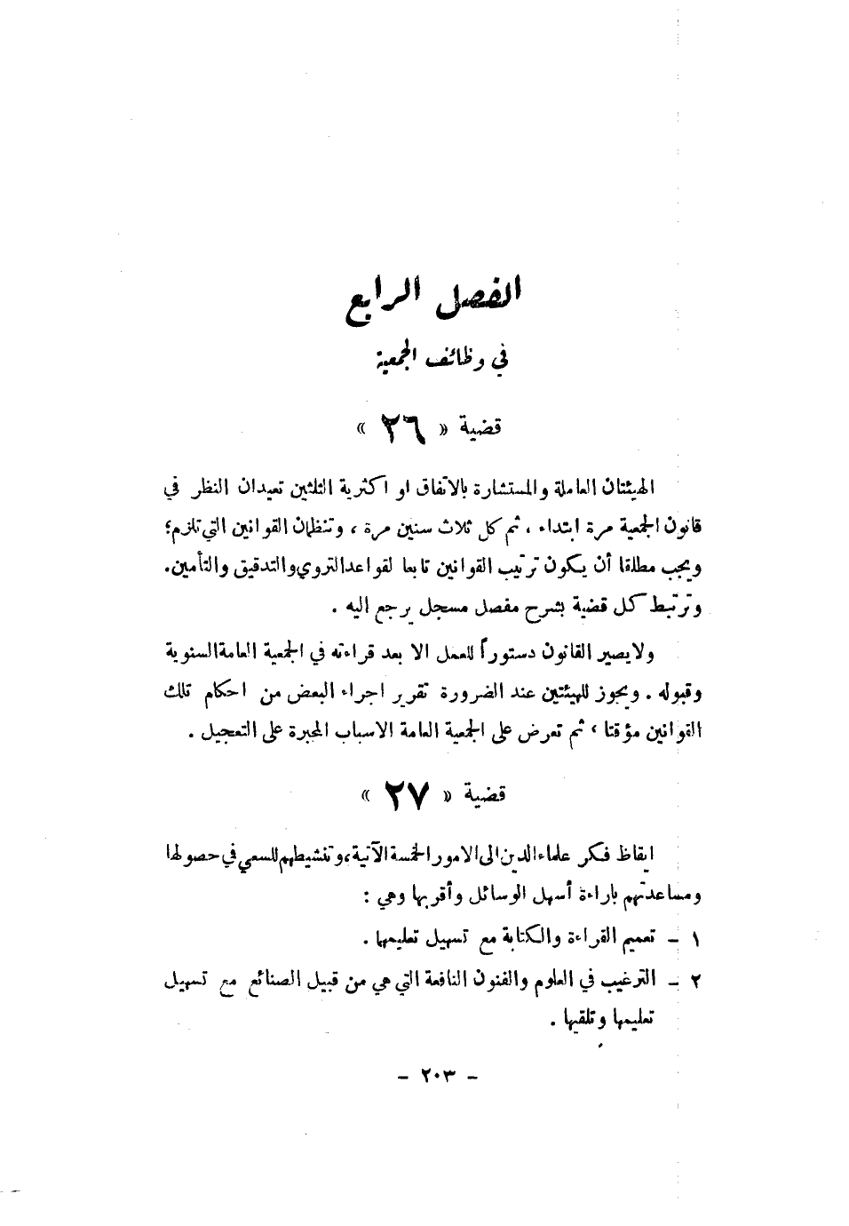 وَلَا يصير القانون دستوراً للْعَمَل إِلَّا بعد قِرَاءَته فِي الجمعية الْعَامَّة السنوية وقبوله. وَيجوز للهيئتين عِنْد الضَّرُورَة تَقْرِير إِجْرَاء الْبَعْض من أَحْكَام تِلْكَ القوانين مؤقتاً، ثمَّ تعرض على الجمعية الْعَامَّة الْأَسْبَاب الْمُجبرَة على التَّعْجِيل.
