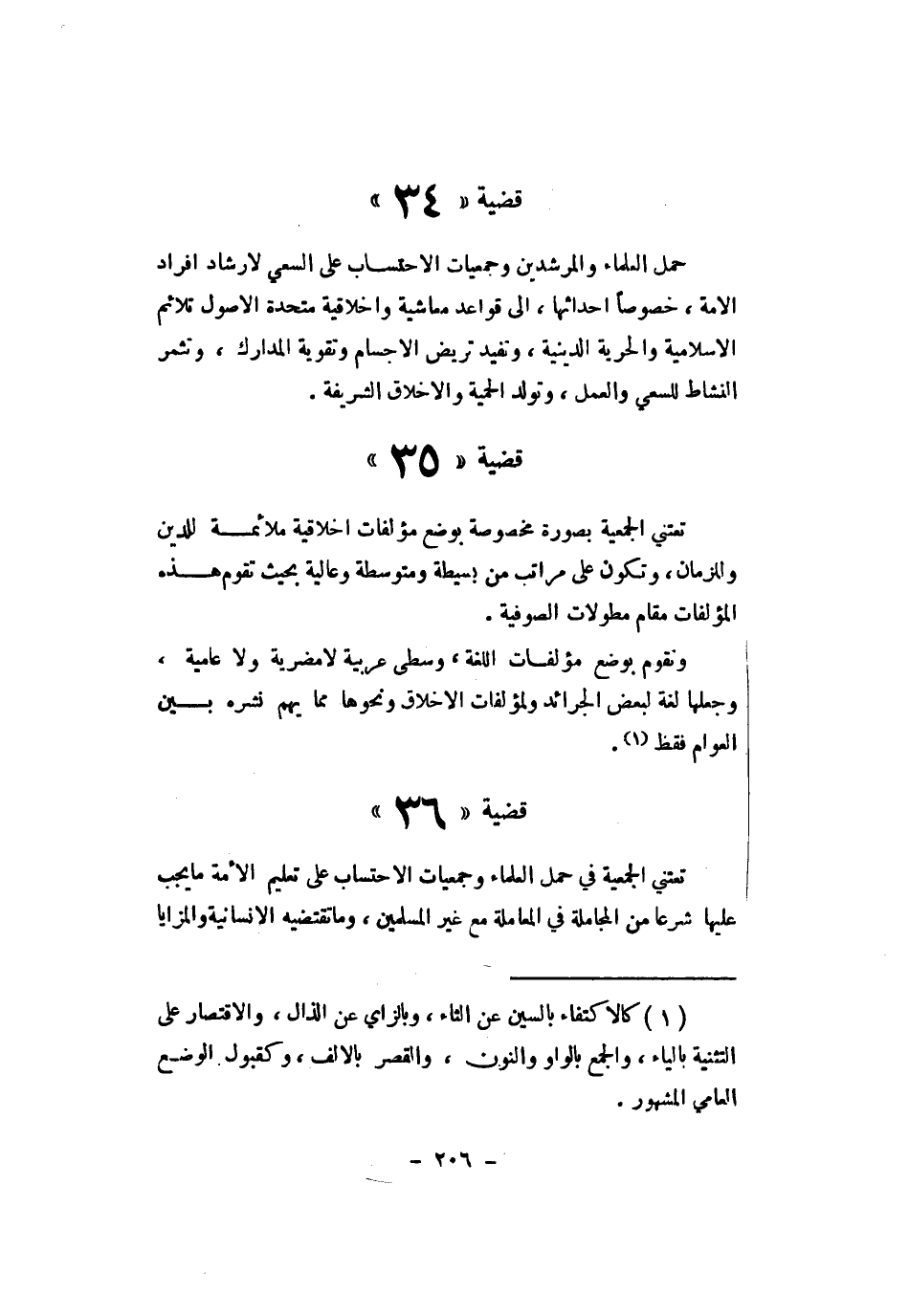 حمل الْعلمَاء والمرشدين وجمعيات الاحتساب على السَّعْي لإرشاد أَفْرَاد الْأمة، خُصُوصا إحداثها، إِلَى قَوَاعِد معاشية وأخلاقية متحدة الْأُصُول تلائم الإسلامية وَالْحريَّة الدِّينِيَّة، وتفيد تريض الْأَجْسَام وتقوية المدارك، وتثمر النشاط للسعي وَالْعَمَل، وتولد الحمية والأخلاق الشَّرِيفَة.