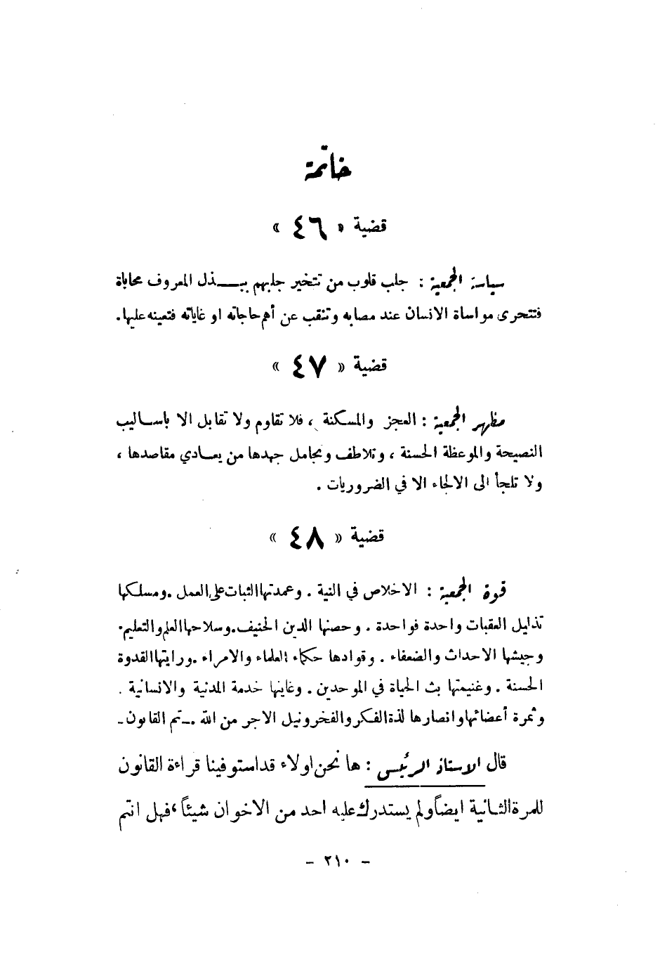 قُوَّة الجمعية: الْإِخْلَاص فِي النِّيَّة، وعمدتها الثَّبَات على الْعَمَل. ومسلكها تذليل العقبات وَاحِدَة فَوَاحِدَة. وحصنها الدّين الحنيف، وسلاحها الْعلم والتعليم. وجيشها الْأَحْدَاث والضعفاء. وقوادها حكماء الْعلمَاء والأمراء. ورايتها الْقدْوَة الْحَسَنَة، وغنيمتها بَث الْحَيَاة فِي الْمُوَحِّدين. وغايتها خدمَة المدنية والإنسانية. وَثَمَرَة أعضائها وأنصارها لَذَّة الْفِكر وَالْفَخْر ونيل الْأجر من الله - تمّ القانون.