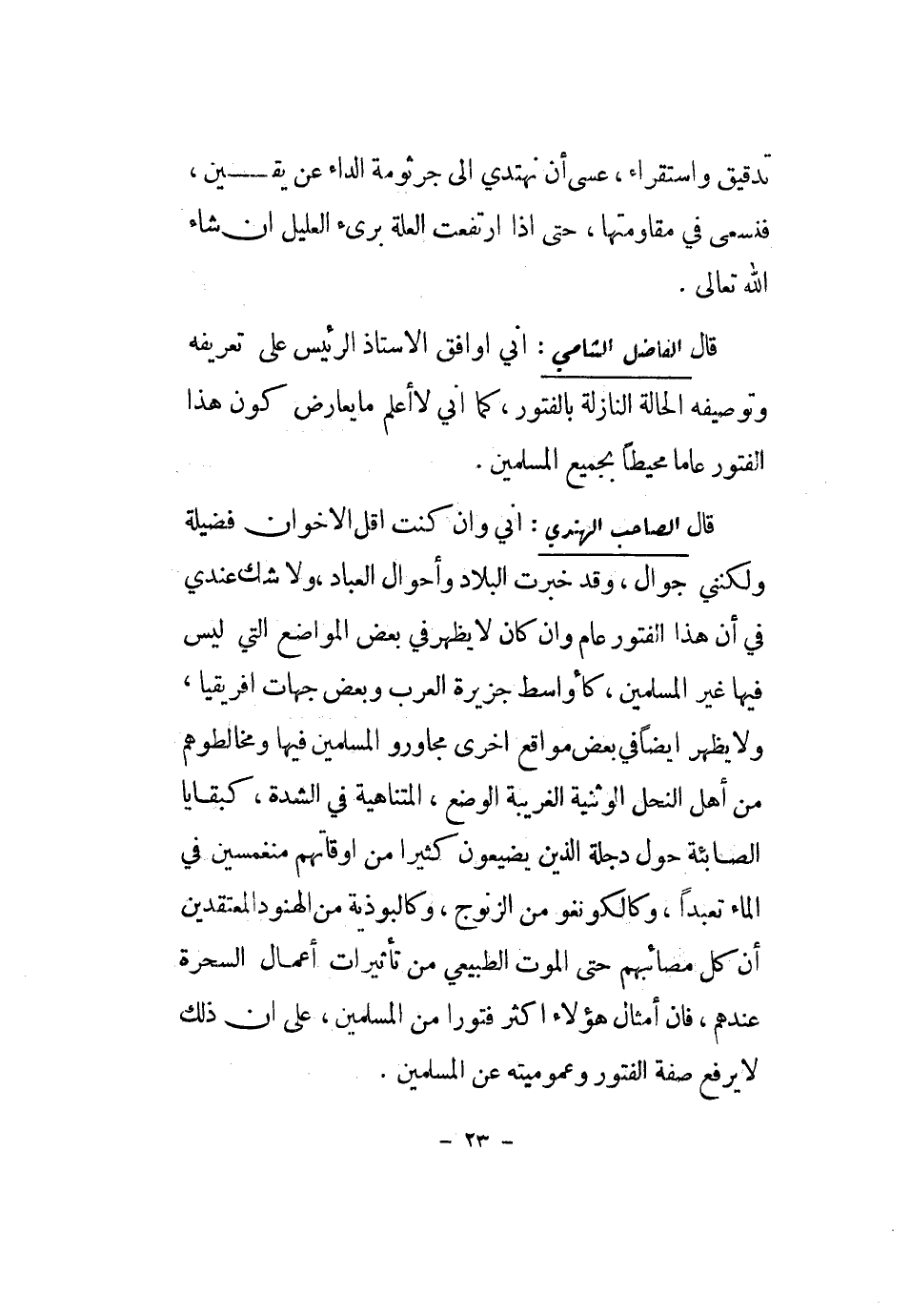 قَالَ الصاحب الْهِنْدِيّ: أَنِّي وَأَن كنت أقل الإخوان فَضِيلَة ولكنني جوال، وَقد خبرت الْبِلَاد وأحوال الْعباد، وَلَا شكّ عِنْدِي فِي أَن هَذَا الفتور عَام وَإِن كَانَ لَا يظْهر فِي بعض الْمَوَاضِع الَّتِي لَيْسَ فِيهَا غير الْمُسلمين، كأواسط جَزِيرَة الْعَرَب وَبَعض جِهَات إفريقيا، وَلَا يظْهر أَيْضا فِي بعض مواقع أُخْرَى مجاورو الْمُسلمين فِيهَا ومخالطوهم من أهل النَّحْل الوثنية الغريبة الْوَضع، المتناهية فِي الشدَّة، كبقايا الصابئة حول دجلة الَّذين يضيعون كثيرا من أوقاتهم منغمسين فِي المَاء تعبداً، وكالكونغو من الزنوج، وكالبوذية من الهنود المعتقدين أَن كل مصائبهم حَتَّى الْمَوْت الطبيعي من تأثيرات أَعمال السَّحَرَة عِنْدهم، فَإِن أَمْثَال هَؤُلَاءِ اكثر فتوراً من الْمُسلمين، على أَن ذَلِك لَا يرفع صفة الفتور وعموميته عَن الْمُسلمين.
