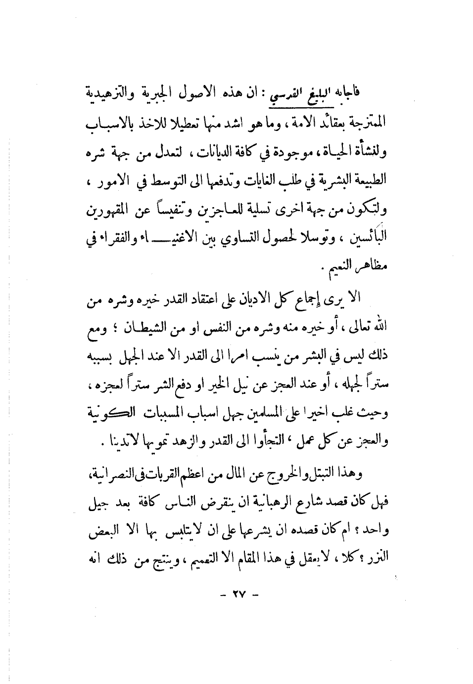 فَأَجَابَهُ البليغ الْقُدسِي: أَن هَذِه الْأُصُول الجبرية والتزهيدية الممتزجة بعقائد الْأمة، وَمَا هُوَ اشد مِنْهَا تعطيلا للأخذ بالأسباب ولنشأة الْحَيَاة، مَوْجُودَة فِي كَافَّة الديانَات لتعدل من جِهَة شَره الطبيعة البشرية فِي طلب الغايات وتدفعها إِلَى التَّوَسُّط فِي الْأُمُور، ولتكون من جِهَة أُخْرَى تَسْلِيَة للعاجزين وتنفيساً عَن المقهورين البائسين، وتوسلاً لحُصُول التَّسَاوِي بَين الْأَغْنِيَاء والفقراء فِي مظَاهر النَّعيم.