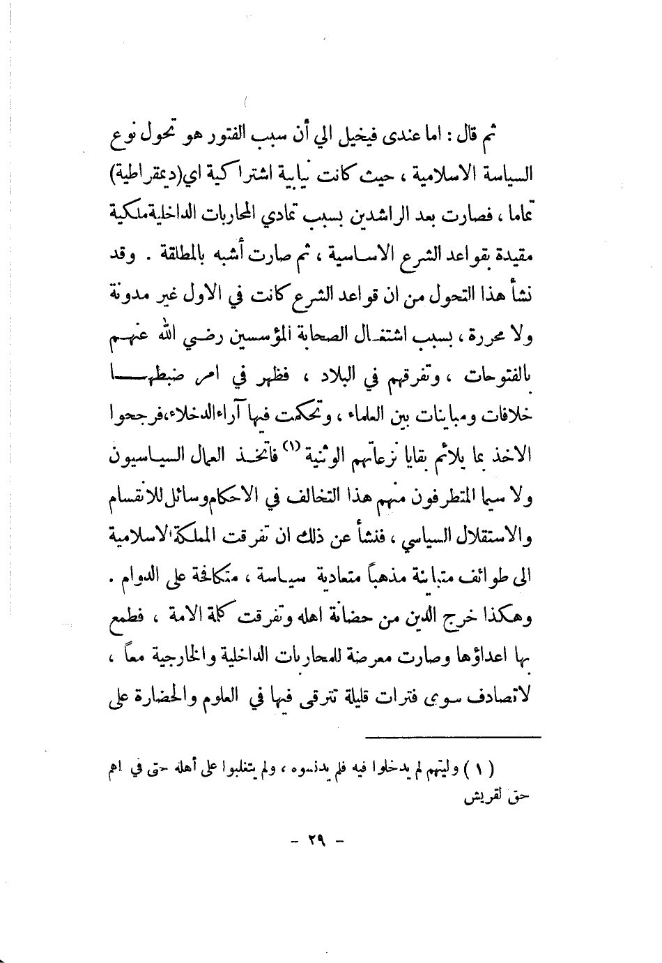 ثمَّ قَالَ: أما عِنْدِي فيخيل إِلَيّ أَن سَبَب الفتور هُوَ تحول نوع السياسة الإسلامية، حَيْثُ كَانَت نيابية اشتراكية أَي (ديمقراطية) تَمامًا، فَصَارَت بعد الرَّاشِدين بِسَبَب تمادي المحاربات الداخلية ملكية مُقَيّدَة بقواعد الشَّرْع الأساسية، ثمَّ صَارَت أشبه بالمطلقة. وَقد نَشأ هَذَا التَّحَوُّل من أَن قَوَاعِد الشَّرْع كَانَت فِي الأول غير مدونة وَلَا محررة، بِسَبَب اشْتِغَال الصَّحَابَة المؤسسين رَضِي الله عَنْهُم بالفتوحات، وتفرقهم فِي الْبِلَاد، فَظهر فِي أَمر ضَبطهَا خلافات ومباينات بَين الْعلمَاء، وتحكمت فِيهَا آراء الدخلاء، فرجحوا الْأَخْذ بِمَا يلائم بقايا نزعاتهم الوثنية فَاتخذ الْعمَّال السياسيون وَلَا سِيمَا المتطرفون مِنْهُم هَذَا التخالف فِي الْأَحْكَام وَسَائِل للانقسام والاستقلال السياسي، فَنَشَأَ عَن ذَلِك أَن تَفَرَّقت المملكة الإسلامية إِلَى طوائف متباينة مذهبا متعادية سياسة، متكافحة على الدَّوَام. وَهَكَذَا خرج الدّين من حضَانَة أَهله وَتَفَرَّقَتْ كلمة الْأمة، فطمع بهَا أعداؤها وَصَارَت معرضة للمحاربات الداخلية والخارجية مَعًا، لَا تصادف سوى فترات قَليلَة تترقى فِيهَا فِي الْعُلُوم والحضارة على