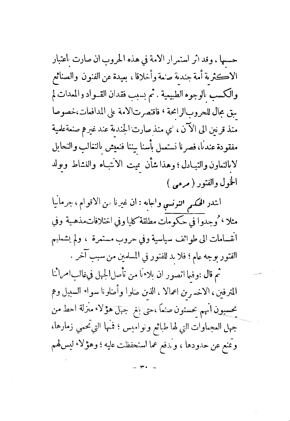حسبها، وَقد أثر اسْتِمْرَار الْأمة فِي هَذِه الحروب أَن صَارَت بِاعْتِبَار الأكثرية أمة جندية صَنْعَة وأخلاقا، بعيدَة عَن الْفُنُون والصنائع وَالْكَسْب بالوجوه الطبيعية. ثمَّ بِسَبَب فقدان القواد والمعدات لم يبْق مجَال للحروب الرابحة، فاقتصرت الْأمة على المدافعات، خُصُوصا مُنْذُ قرنين إِلَى الْآن، أَي مُنْذُ صَارَت الجندية عِنْد غَيرهم صَنْعَة علمية مفقودة عندنَا، فصرنا نستعمل بأسنا بَيْننَا فنعيش بالتغالب والتحايل لَا بالتعاون والتبادل؛ وَهَذَا شَأْن يُمِيت الانتباه والنشاط ويولد الخمول والفتور (مرحى) .