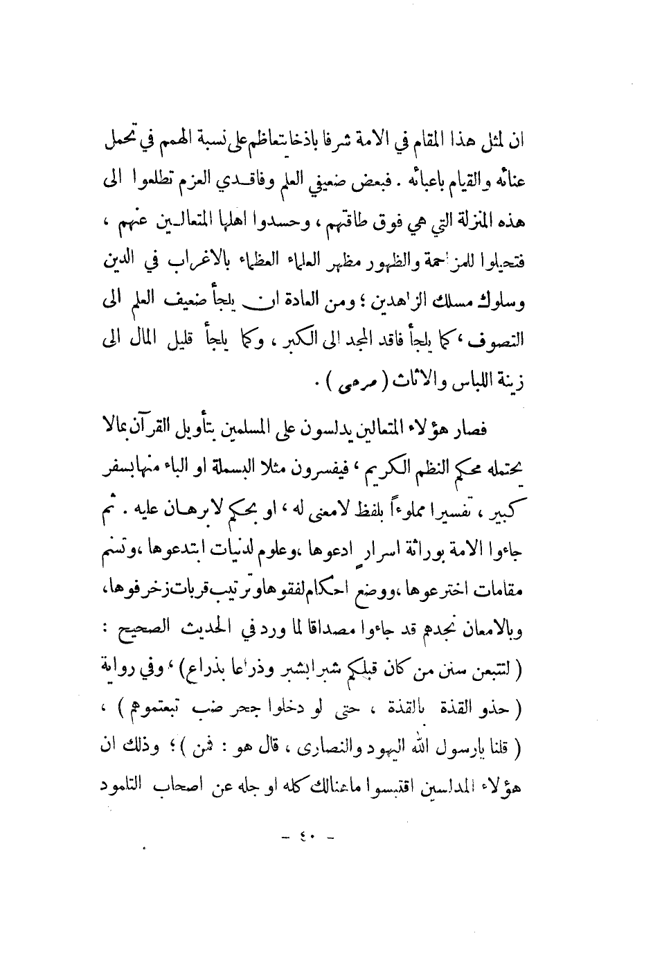 فَصَارَ هَؤُلَاءِ المتعالين يدلسون على الْمُسلمين بِتَأْوِيل الْقُرْآن بِمَا لَا يحْتَملهُ مُحكم النّظم الْكَرِيم، فيفسرون مثلا الْبَسْمَلَة أَو الْبَاء مِنْهَا بسفر كَبِير، تَفْسِيرا مملوءاً بِلَفْظ لَا معنى لَهُ، أَو بِحكم لَا برهَان عَلَيْهِ. ثمَّ جَاءُوا الْأمة بوراثة أسرار أدعوها، وعلوم لدنيات ابتدعوها، وتسنم مقامات اخترعوها، وَوضع أَحْكَام لفقوها وترتيب قربات زخرفوها، وبالإمعان نجدهم قد جَاءُوا مصداقا لما ورد فِي الحَدِيث الصَّحِيح: (لتتبعن سنَن من كَانَ قبلكُمْ شبْرًا بشبر وذراعا بِذِرَاع) ، وَفِي رِوَايَة (حَذْو القذة بالقذة، حَتَّى لَو دخلُوا جُحر ضَب تبعتموهم) ، (قُلْنَا يَا رَسُول الله الْيَهُود وَالنَّصَارَى، قَالَ هُوَ: فَمن) ؛ وَذَلِكَ أَن هَؤُلَاءِ المدلسين اقتبسوا مَا هُنَالك كُله أَو جله عَن أَصْحَاب التلمود