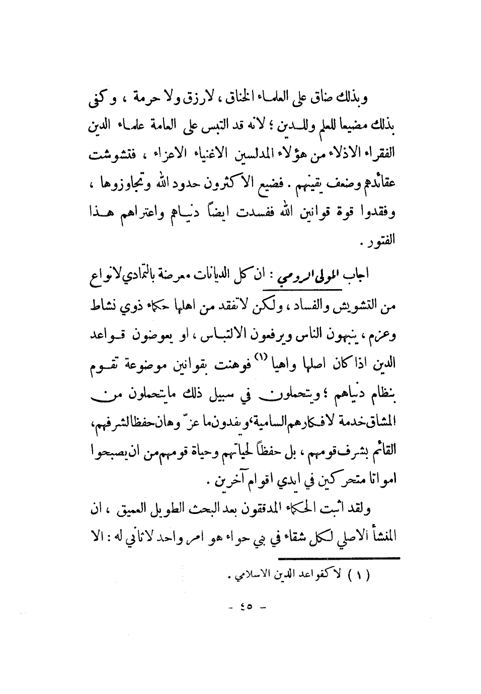 أجَاب الْمولى الرُّومِي: أَن كل الديانَات معرضة بالتمادي لأنواع من التشويش وَالْفساد، وَلَكِن لَا تفقد من أَهلهَا حكماء ذَوي نشاط وعزم، ينبهون النَّاس ويرفعون الالتباس، أَو يعوضون قَوَاعِد الدّين إِذا كَانَ أَصْلهَا واهيا فوهنت بقوانين مَوْضُوعَة تقوم بنظام دنياهم؛ ويتحملون فِي سَبِيل ذَلِك مَا يتحملون من المشاق خدمَة لأفكارهم السامية، ويفدون مَا عز وَهَان حفظا لشرفهم، الْقَائِم بشرف قَومهمْ، بل حفظا لحياتهم وحياة قَومهمْ من أَن يصبحوا أَمْوَاتًا متحركين فِي أَيدي أَقوام آخَرين.