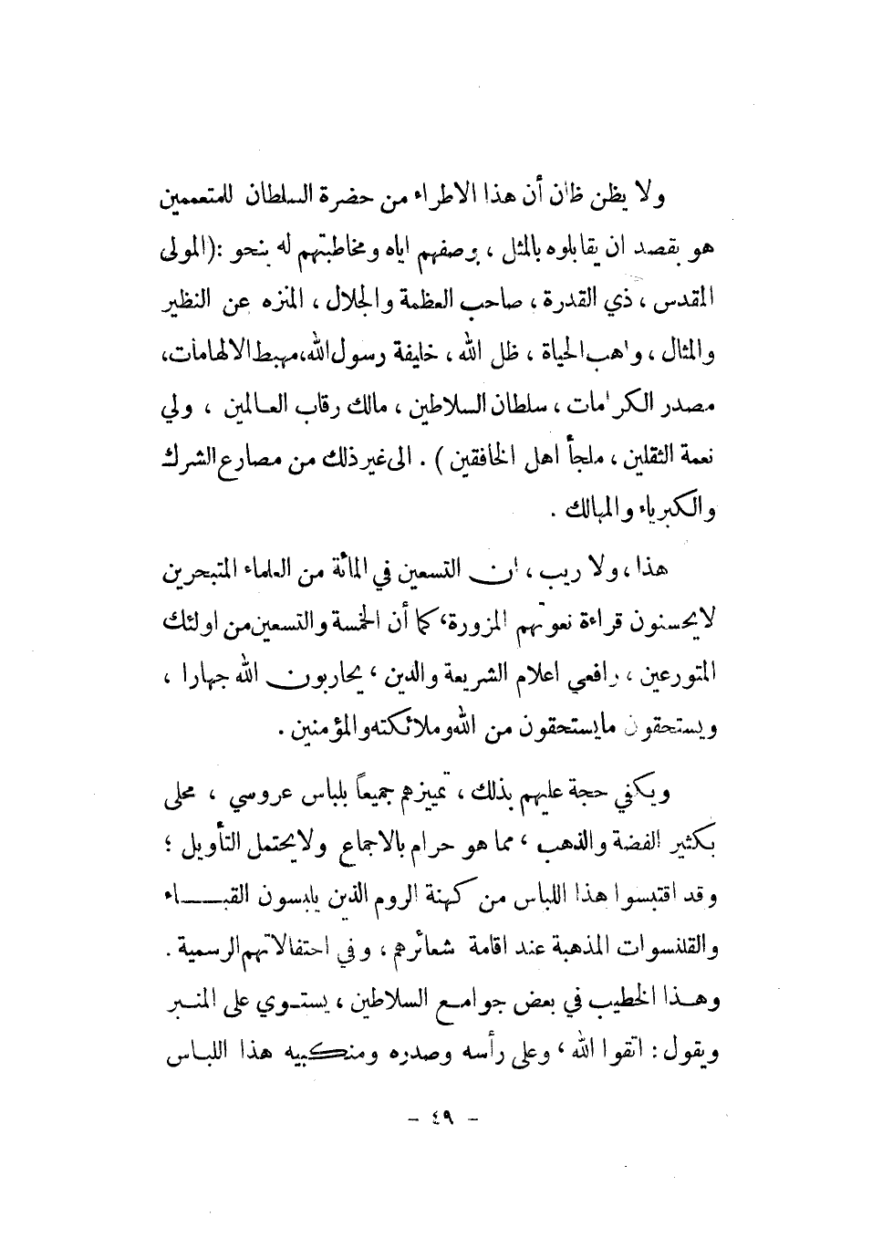 وَلَا يظنّ ظان أَن هَذَا الإطراء من حَضْرَة السُّلْطَان للمتعممين هُوَ بِقصد أَن يقابلوه بِالْمثلِ، وَصفهم إِيَّاه ومخاطبتهم لَهُ بِنَحْوِ: (الْمولى الْمُقَدّس، ذِي الْقُدْرَة، صَاحب العظمة والجلال، المنزه عَن النظير والمثال، واهب الْحَيَاة، ظلّ الله، خَليفَة رَسُول الله، مهبط الإلهامات، مصدر الكرامات، سُلْطَان السلاطين، مَالك رِقَاب الْعَالمين، ولي نعْمَة الثقلَيْن، ملْجأ أهل الْخَافِقين) . إِلَى غير ذَلِك من مصَارِع الشّرك والكبرياء والمهالك.