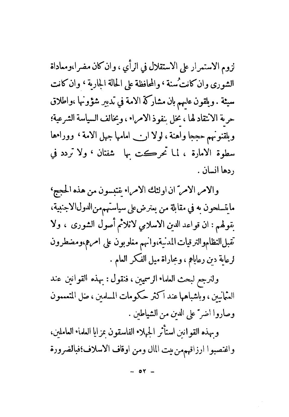 لُزُوم الِاسْتِمْرَار على الِاسْتِقْلَال فِي الرَّأْي، وَإِن كَانَ مضراً، ومعاداة الشورى وَإِن كَانَت سنة، والمحافظة على الْحَالة الْجَارِيَة، وَإِن كَانَت سَيِّئَة، ويلقون عَلَيْهِم بِأَن مُشَاركَة الْأمة فِي تَدْبِير شؤونها، وَإِطْلَاق حريَّة الانتقاد لَهَا، يخل بنفوذ الْأُمَرَاء، وَيُخَالف السياسة الشَّرْعِيَّة؛ ويلقنونهم حجَجًا واهنة، لَوْلَا أَن أمامها جهل الْأمة، ووراءها سطوة الْإِمَارَة، لما تحركت بهَا شفتان، وَلَا تردد فِي ردهَا إِنْسَان.