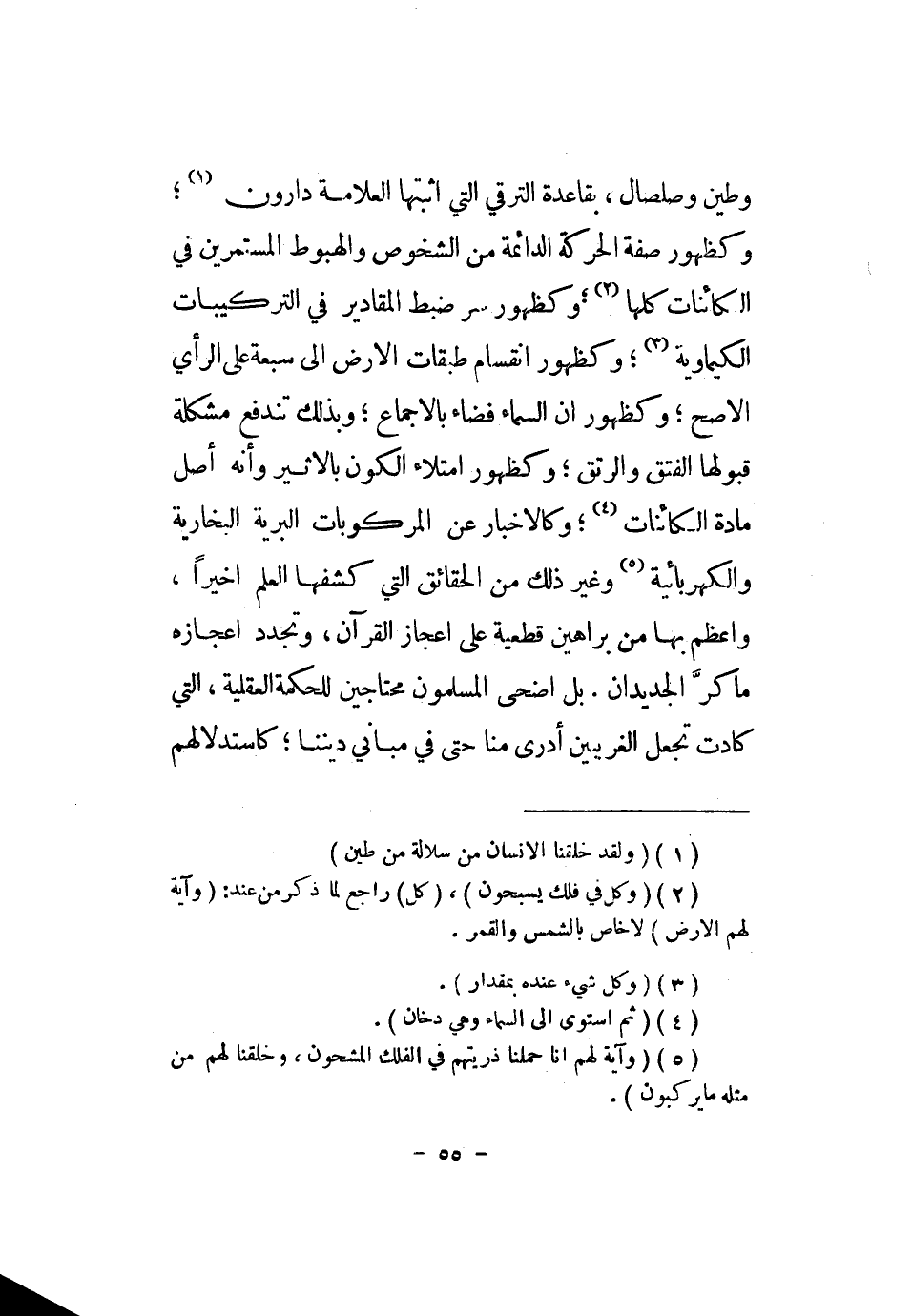 وطين وصلصال، بقاعدة الترقي الَّتِي أثبتها الْعَلامَة دارون؛ وكظهور صفة الْحَرَكَة الدائمة من الشخوص والهبوط المستمرين فِي الكائنات كلهَا؛ وكظهور سر ضبط الْمَقَادِير فِي التركيبات الكيماوية؛ وكظهور انقسام طَبَقَات الأَرْض إِلَى سَبْعَة على الرَّأْي الْأَصَح؛ وكظهور أَن السَّمَاء فضاء بِالْإِجْمَاع؛ وَبِذَلِك تنْدَفع مشكلة قبُولهَا الفتق والرتق؛ وكظهور امتلاء الْكَوْن بالأثير وَأَنه أصل مَادَّة الكائنات؛ وكالأخبار عَن المركوبات الْبَريَّة البخارية والكهربائية وَغير ذَلِك من الْحَقَائِق الَّتِي كشفها الْعلم أخيراً، واعظم بهَا من براهين قَطْعِيَّة على إعجاز الْقُرْآن، وتجدد إعجازه مَا كرّ الجديدان. بل أضحى الْمُسلمُونَ مُحْتَاجين للحكمة الْعَقْلِيَّة، الَّتِي كَادَت تجْعَل الغربيين أدرى منا حَتَّى فِي مباني ديننَا؛ كاستدلالهم