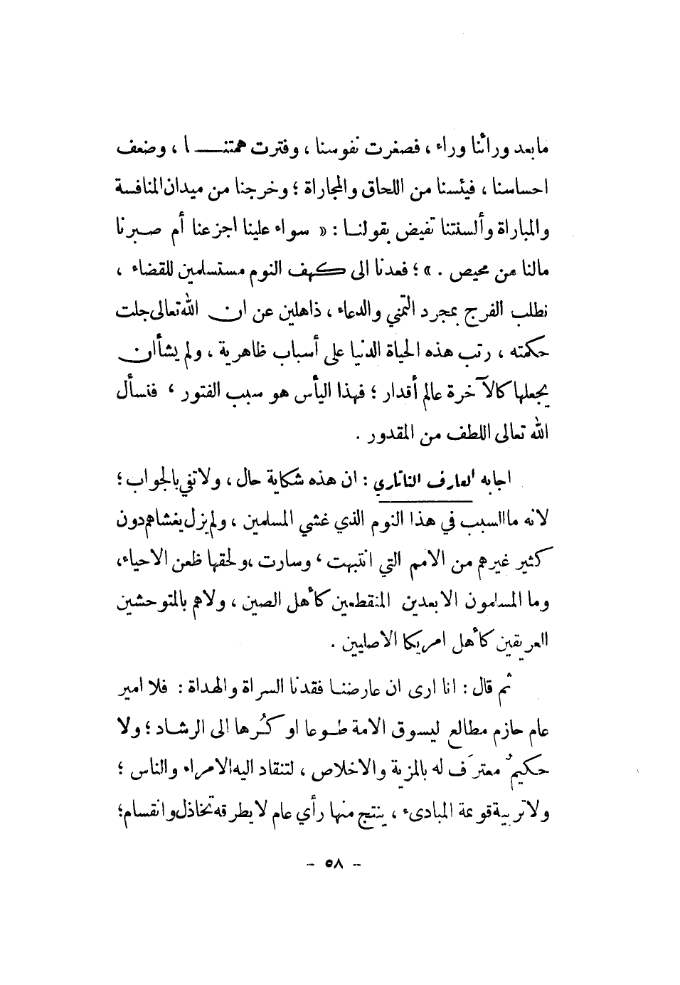 ثمَّ قَالَ: أَنا أرى أَن عَارَضنَا فَقدنَا السراة والهداة: فَلَا أَمِير عَام حَازِم مطالع ليسوق الْأمة طَوْعًا أَو كرها إِلَى الرشاد؛ وَلَا حَكِيم معترف لَهُ بالمزية وَالْإِخْلَاص، لتنقاد إِلَيْهِ الْأُمَرَاء وَالنَّاس؛ وَلَا تربية قويمة المبادئ، ينْتج مِنْهَا رَأْي عَام لَا يطرقه تخاذل وانقسام؛