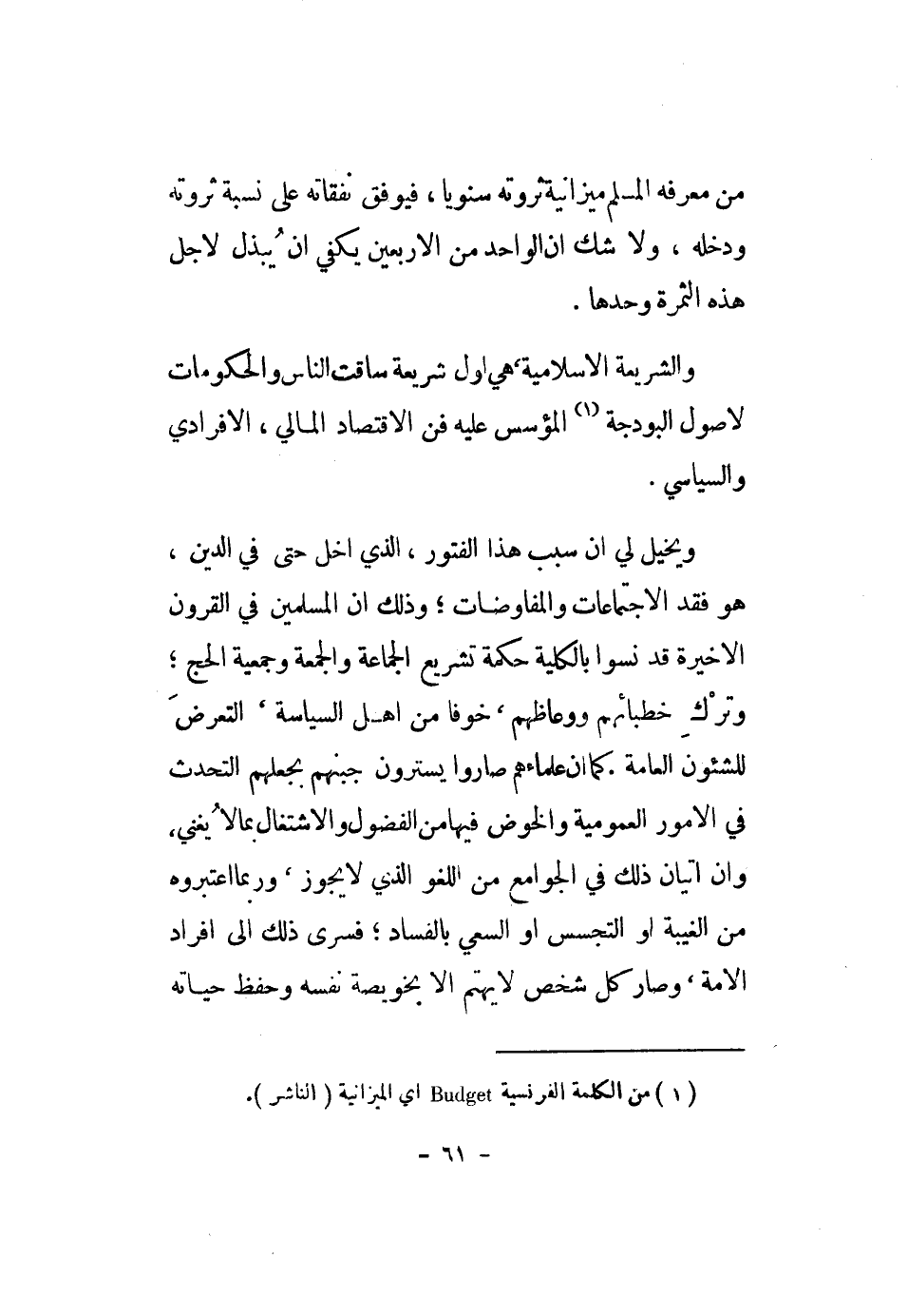 ويخيل لي أَن سَبَب هَذَا الفتور، الَّذِي أخل حَتَّى فِي الدّين، هُوَ فقد الاجتماعات والمفاوضات؛ وَذَلِكَ أَن الْمُسلمين فِي الْقُرُون الْأَخِيرَة قد نسوا بِالْكُلِّيَّةِ حِكْمَة تشريع الْجَمَاعَة وَالْجُمُعَة وجمعية الْحَج؛ وَترك خطبائهم ووعاظهم، خوفًا من أهل السياسة، التَّعَرُّض للشؤون الْعَامَّة. كَمَا أَن علماءهم صَارُوا يسترون جبنهم بجعلهم التحدث فِي الْأُمُور العمومية والخوض فِيهَا من الفضول والاشتغال بِمَا لَا يُغني، وَإِن إتْيَان ذَلِك فِي الْجَوَامِع من اللَّغْو الَّذِي لَا يجوز، وَرُبمَا اعتبروه من الْغَيْبَة أَو التَّجَسُّس أَو السَّعْي بِالْفَسَادِ؛ فسرى ذَلِك إِلَى إِفْرَاد الْأمة، وَصَارَ كل شخص لَا يهتم إِلَّا بخويصة نَفسه وَحفظ حَيَاته
