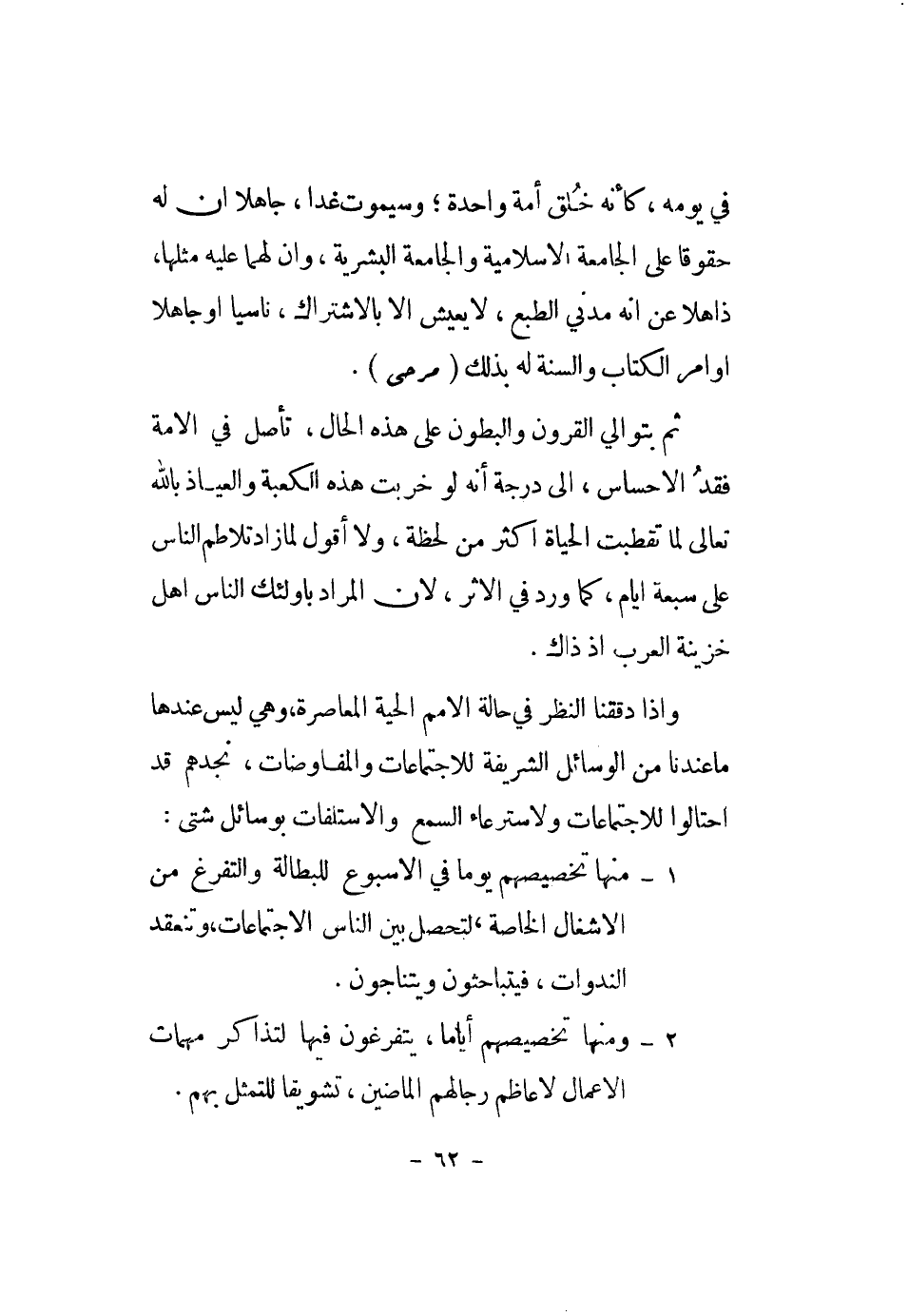 فِي يَوْمه، كَأَنَّهُ خلق أمة وَاحِدَة، وسيموت غَدا، جَاهِلا أَن لَهُ حقوقا على الجامعة الإسلامية والجامعة البشرية، وَإِن لَهما عَلَيْهِ مثلهَا، ذاهلاً عَن أَنه مدنِي الطَّبْع، لَا يعِيش إِلَّا بالاشتراك، نَاسِيا أَو جَاهِلا أوَامِر الْكتاب وَالسّنة لَهُ بذلك (مرحى) .