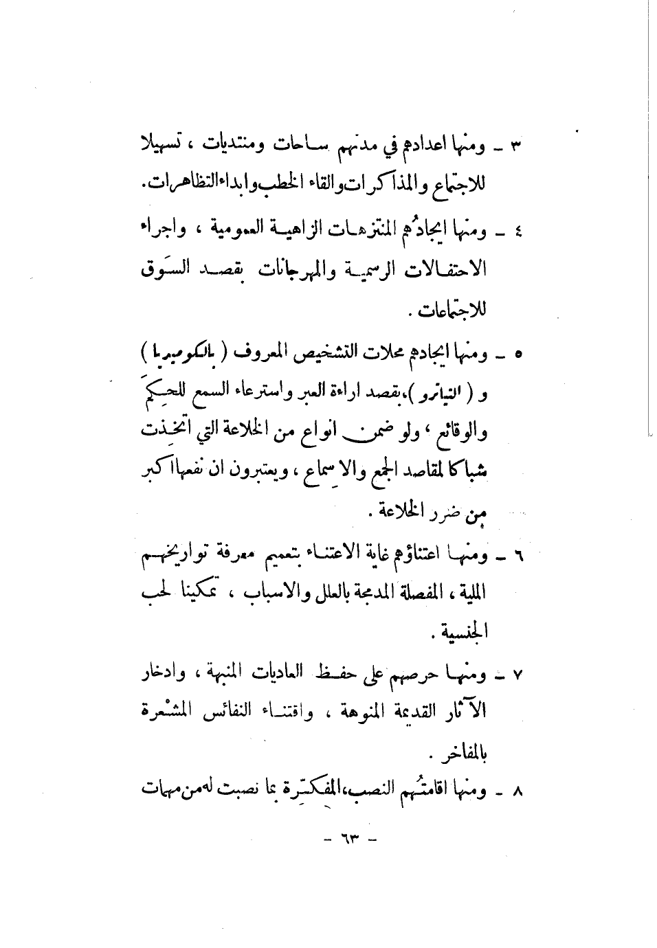 4 - وَمِنْهَا إيجادهم المنتزهات الزاهية العمومية، وإجراء الاحتفالات الرسمية والمهرجانات بِقصد السُّوق للاجتماعات.