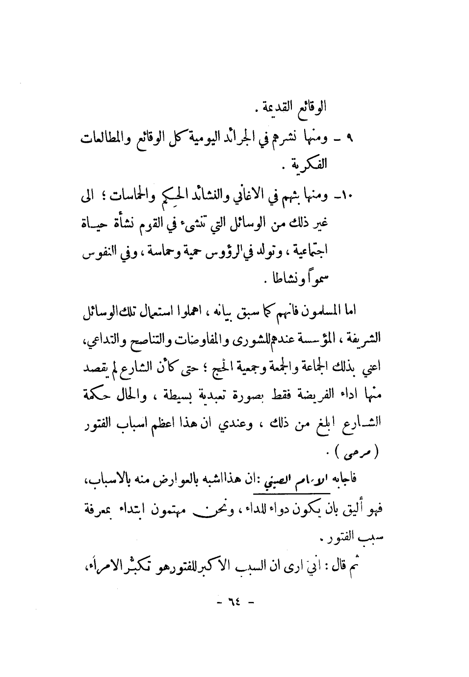أما الْمُسلمُونَ فَإِنَّهُم كَمَا سبق بَيَانه، أهملوا اسْتِعْمَال تِلْكَ الْوَسَائِل الشَّرِيفَة، المؤسسة عِنْدهم للشورى والمفاوضات والتناصح والتداعي، أَعنِي بذلك الْجَمَاعَة وَالْجُمُعَة وجمعية الْحَج؛ حَتَّى كَأَن الشَّارِع لم يقْصد مِنْهَا أَدَاء الْفَرِيضَة فَقَط بِصُورَة تعبدية بسيطة، وَالْحَال حِكْمَة الشَّارِع أبلغ من ذَلِك، وَعِنْدِي أَن هَذَا أعظم أَسبَاب الفتور (مرحى) .