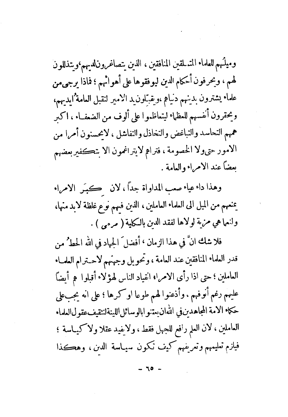 فَلَا شكّ أَن فِي هَذَا الزَّمَان، أفضل الْجِهَاد فِي الله الْحَط من قدر الْعلمَاء الْمُنَافِقين عِنْد الْعَامَّة، وتحويل وجهتهم لاحترام الْعلمَاء العاملين؛ حَتَّى إِذا رأى الْأُمَرَاء انقياد النَّاس لهَؤُلَاء أَقبلُوا هم أَيْضا عَلَيْهِم رغم أنوفهم. وأذعنوا لَهُم طَوْعًا أَو كرها؛ على أَنه يجب على حكماء الْأمة الْمُجَاهدين فِي الله أَن يعتنوا بالوسائل اللينة لتثقيف عقول الْعلمَاء العاملين، لِأَن الْعلم رَافع للْجَهْل فَقَط، وَلَا يُفِيد عقلا وَلَا كياسة؛ فَيلْزم تعليمهم وتعريفهم كَيفَ تكون سياسة الدّين، وَهَكَذَا