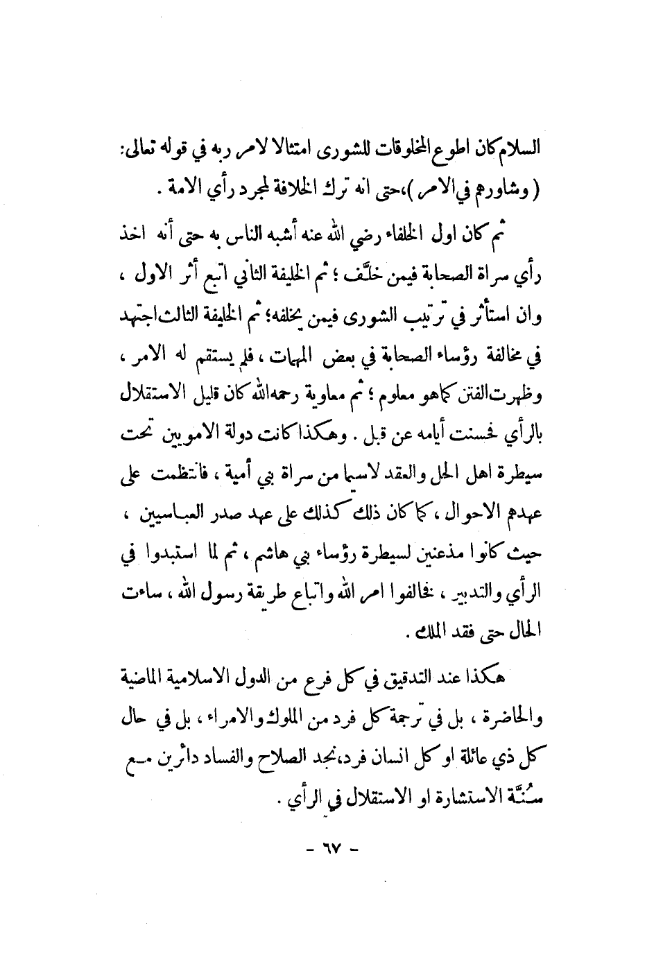 هَكَذَا عِنْد التدقيق فِي كل فرع من الدول الإسلامية الْمَاضِيَة والحاضرة، بل فِي تَرْجَمَة كل فَرد من الْمُلُوك والأمراء، بل فِي حَال كل ذِي عائلة أَو كل إِنْسَان فَرد، نجد الصّلاح وَالْفساد دائرين مَعَ سنة الاستشارة أَو الِاسْتِقْلَال فِي الرَّأْي.