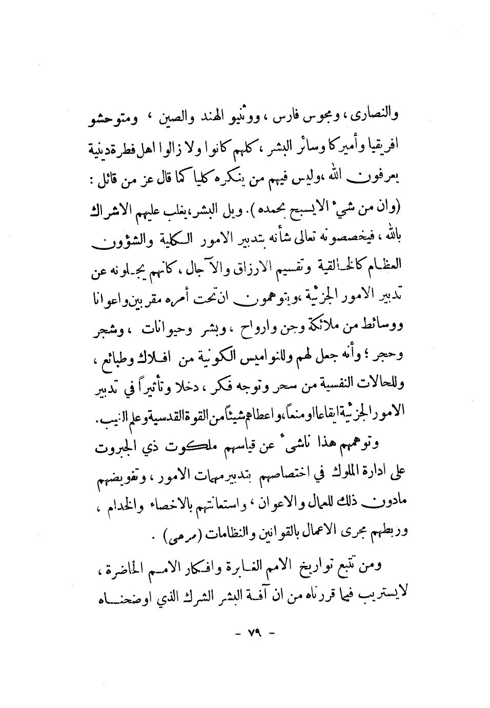وَالنَّصَارَى، ومجوس فَارس، ووثنيو الْهِنْد والصين، ومتوحشو إفريقيا وأمريكا وَسَائِر الْبشر، كلهم كَانُوا وَلَا زَالُوا أهل فطْرَة دينية يعْرفُونَ الله، وَلَيْسَ فيهم من يُنكره كليا كَمَا قَالَ عز من قَائِل: (وَإِن من شَيْء إِلَّا يسبح بِحَمْدِهِ) . ويل الْبشر، يغلب عَلَيْهِم الْإِشْرَاك بِاللَّه، فيخصصونه تَعَالَى شَأْنه بتدبير الْأُمُور الْكُلية والشؤون الْعِظَام كالخالقية وتقسيم الأرزاق والآجال، كَأَنَّهُمْ يجلونه عَن تَدْبِير الْأُمُور الْجُزْئِيَّة، ويتوهمون أَن تَحت أمره مقربين وأعوانا ووسائط من مَلَائِكَة وجن وأرواح، وَبشر وحيوانات، وَشَجر وَحجر؛ وَأَنه جعل لَهُم وللنواميس الكونية من أفلاك وطبائع، وللحالات النفسية من سحر وَتوجه فكر، دخلا وتأثيراً فِي تَدْبِير الْأُمُور الْجُزْئِيَّة إيقاعاً أَو منعا، وَأَعْطَاهُمْ شَيْئا من الْقُوَّة القدسية وَعلم الْغَيْب.