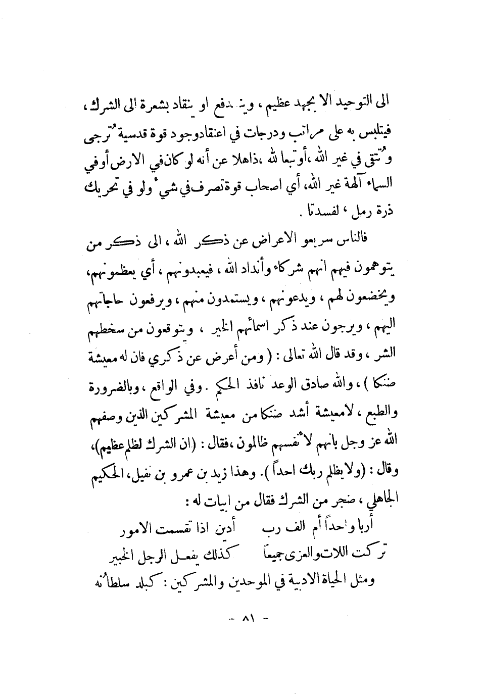 فَالنَّاس سريعو الْأَعْرَاض عَن ذكر الله، إِلَى ذكر من يتوهمون فيهم أَنهم شُرَكَاء وأنداد الله، فيعبدونهم، أَي يعظمونهم، ويخضعون لَهُم، ويدعونهم، ويستمدون مِنْهُم، ويرفعون حاجاتهم إِلَيْهِم، ويرجون عِنْد ذكر أسمائهم الْخَيْر، ويتوقعون من سخطهم الشَّرّ، وَقد قَالَ الله تَعَالَى: {وَمن أعرض عَن ذكري فَإِن لَهُ معيشة ضنكا} ، وَالله صَادِق الْوَعْد نَافِذ الحكم. وَفِي الْوَاقِع، وبالضرورة والطبع، لَا معيشة أَشد ضنكا من معيشة الْمُشْركين الَّذين وَصفهم الله عز وَجل بِأَنَّهُم لأَنْفُسِهِمْ ظَالِمُونَ، فَقَالَ: {إِن الشّرك لظلم عَظِيم} ، وَقَالَ: {وَلَا يظلم رَبك أحدا} . وَهَذَا زيد بن عَمْرو بن نفَيْل، الْحَكِيم الجاهلي، ضجر من الشّرك فَقَالَ من أَبْيَات لَهُ: