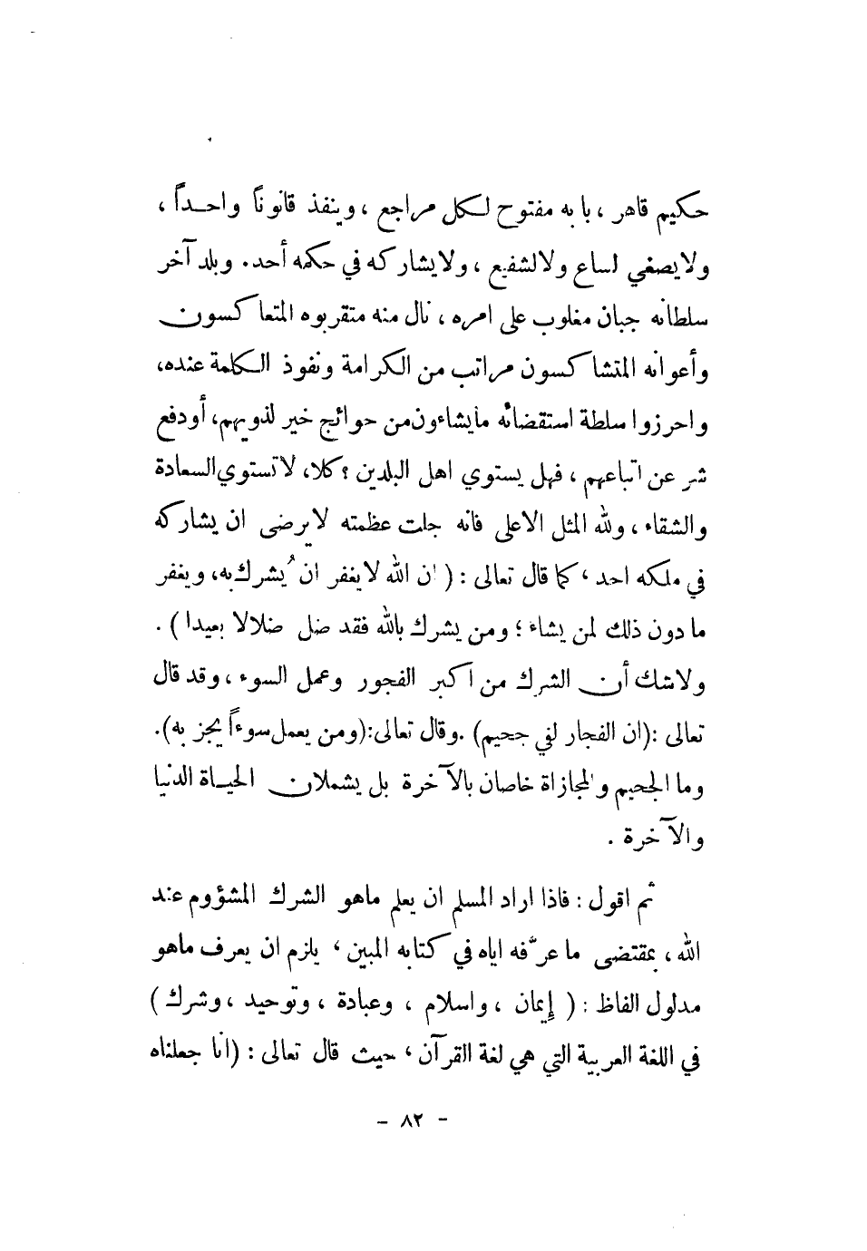 ثمَّ أَقُول: فَإِذا أَرَادَ الْمُسلم أَن يعلم مَا هُوَ الشّرك المشؤوم عِنْد الله، بِمُقْتَضى مَا عرفه إِيَّاه فِي كِتَابه الْمُبين، يلْزم أَن يعرف مَا هُوَ مَدْلُول أَلْفَاظ: (إِيمَان، وَإِسْلَام، وَعبادَة، وتوحيد، وشرك) فِي اللُّغَة الْعَرَبيَّة الَّتِي هِيَ لُغَة الْقُرْآن، حَيْثُ قَالَ تَعَالَى: (أَنا جَعَلْنَاهُ