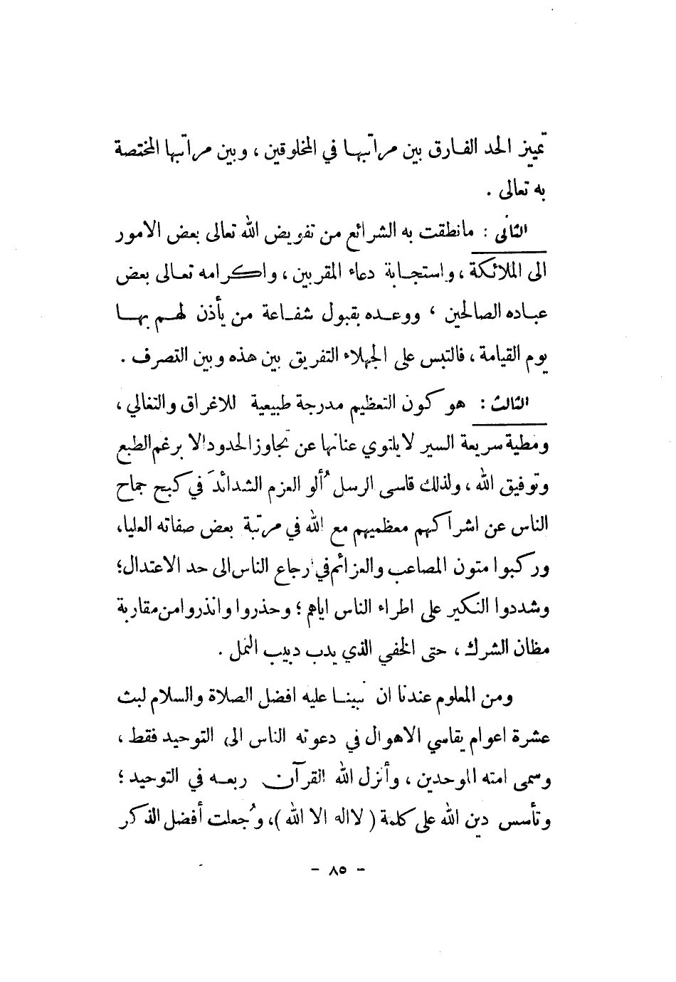 وَمن الْمَعْلُوم عندنَا أَن نَبينَا عَلَيْهِ أفضل الصَّلَاة وَالسَّلَام لبث عشرَة أَعْوَام يقاسي الْأَهْوَال فِي دَعوته النَّاس إِلَى التَّوْحِيد فَقَط، وسمى أمته الْمُوَحِّدين، وَأنزل الله الْقُرْآن ربعه فِي التَّوْحِيد؛ وتأسس دين الله على كلمة (لَا إِلَه إِلَّا الله) و، وَجعلت أفضل الذّكر
