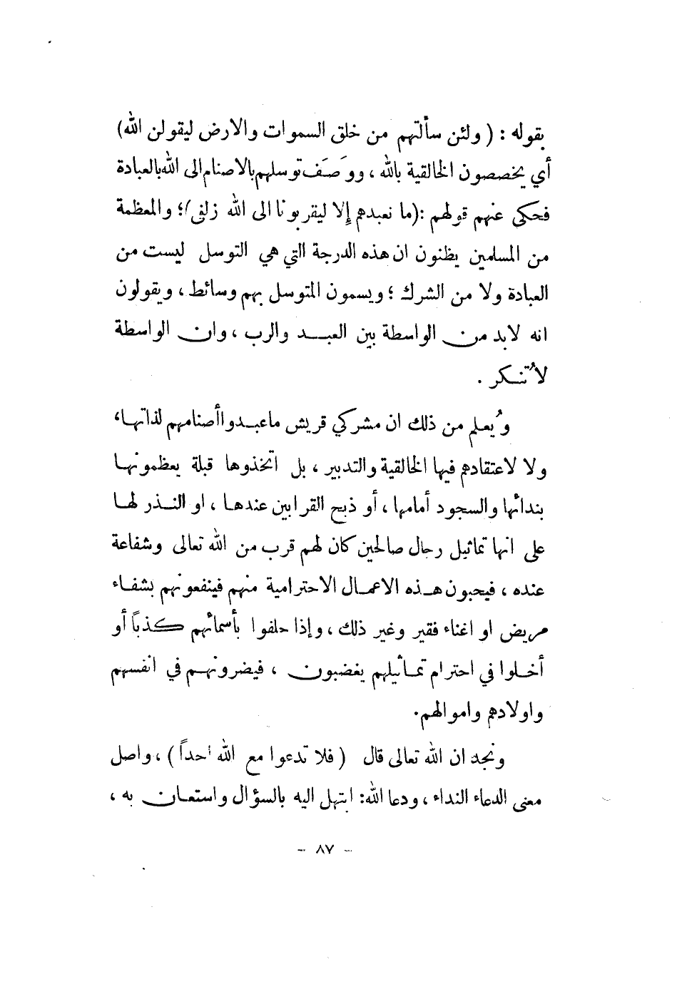 بقوله: {وَلَئِن سَأَلتهمْ من خلق السَّمَاوَات وَالْأَرْض ليَقُولن الله} أَي يخصصون الخالقية بِاللَّه، وَوصف توسلهم بالأصنام إِلَى الله بِالْعبَادَة فَحكى عَنْهُم قَوْلهم: {مَا نعبدهم إِلَّا ليقربونا إِلَى الله زلفى؛ والمعظمة من الْمُسلمين يظنون أَن هَذِه الدرجَة الَّتِي هِيَ التوسل لَيست من الْعِبَادَة وَلَا من الشّرك؛ ويسمون المتوسل بهم وسائط، وَيَقُولُونَ أَنه لَا بُد من الْوَاسِطَة بَين العَبْد والرب، وَإِن الْوَاسِطَة لَا تنكر.