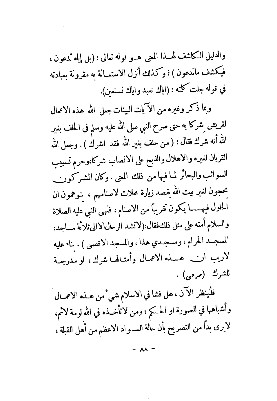 وَبِمَا ذكر وَغَيره من الْآيَات الْبَينَات جعل الله هَذِه الْأَعْمَال لقريش شركا بِهِ حَتَّى صرح النَّبِي [صلى الله عَلَيْهِ وَسلم] فِي الْحلف بِغَيْر الله أَنه شرك فَقَالَ: {من حلف بِغَيْر الله فقد أشرك} . وَجعل الله القربان لغيره والإهلال وَالذّبْح على الأنصاب شركا، وَحرم تسييب السوائب والبحائر لما فِيهَا من ذَلِك الْمَعْنى. وَكَانَ الْمُشْركُونَ يحجون لغير بَيت الله بِقصد زِيَارَة محلات لأصنامهم، يتوهمون أَن الْحُلُول فِيهَا يكون تَقْرِيبًا من الْأَصْنَام، فَنهى النَّبِي [صلى الله عَلَيْهِ وَسلم] أمته على مثل ذَلِك فَقَالَ: (لَا تشد الرّحال إِلَّا إِلَى ثَلَاثَة مَسَاجِد: الْمَسْجِد الْحَرَام، ومسجدي هَذَا، وَالْمَسْجِد الْأَقْصَى) . بِنَاء عَلَيْهِ لَا ريب أَن هَذِه الْأَعْمَال وأمثالها شرك، أَو مدرجة للشرك (مرحى) .