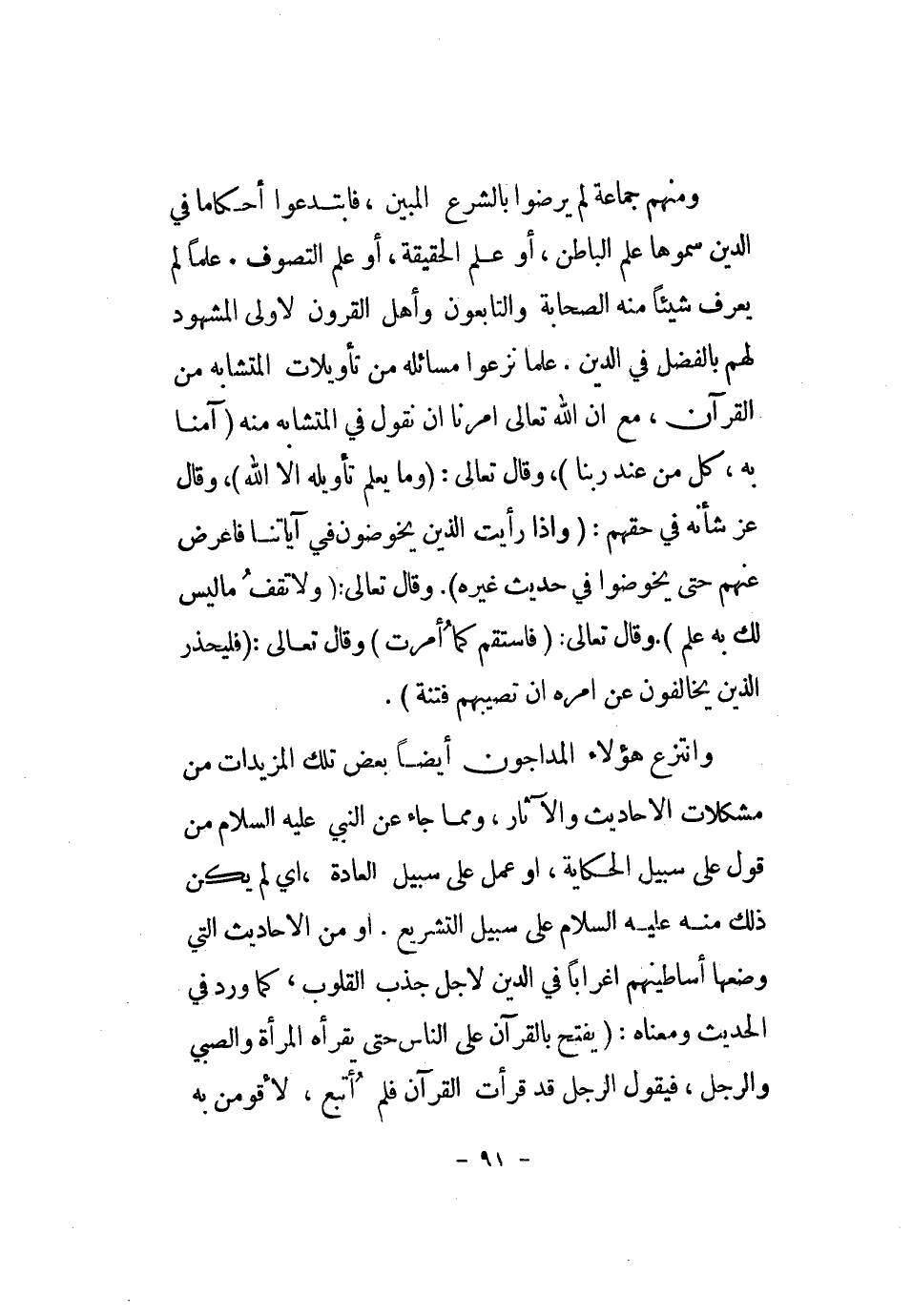 وَمِنْهُم جمَاعَة لم يرْضوا بِالشَّرْعِ الْمُبين، فابتدعوا أحكاماً فِي الدّين سَموهَا علم الْبَاطِن، أَو علم الْحَقِيقَة، أَو علم التصوف، علما لم يعرف شَيْئا مِنْهُ الصَّحَابَة والتابعون وَأهل الْقُرُون لأولى الْمَشْهُود لَهُم بِالْفَضْلِ فِي الدّين. علما نزعوا مسائلة من تأويلات الْمُتَشَابه من الْقُرْآن، مَعَ أَن الله تَعَالَى امرنا أَن نقُول فِي الْمُتَشَابه مِنْهُ (آمنا بِهِ، كل من عِنْد رَبنَا) ، وَقَالَ تَعَالَى: {وَمَا يعلم تَأْوِيله إِلَّا الله} ، وَقَالَ عز شَأْنه فِي حَقهم: {وَإِذا رَأَيْت الَّذين يَخُوضُونَ فِي آيَاتنَا فَأَعْرض عَنْهُم حَتَّى يخوضوا فِي حَدِيث غَيره} وَقَالَ تَعَالَى: {وَلَا تقف مَا لَيْسَ لَك بِهِ علم} وَقَالَ تَعَالَى {فاستقم كَمَا أمرت} وَقَالَ تَعَالَى: {فليحذر الَّذين يخالفون عَن أمره أَن تصيبهم فتْنَة} .