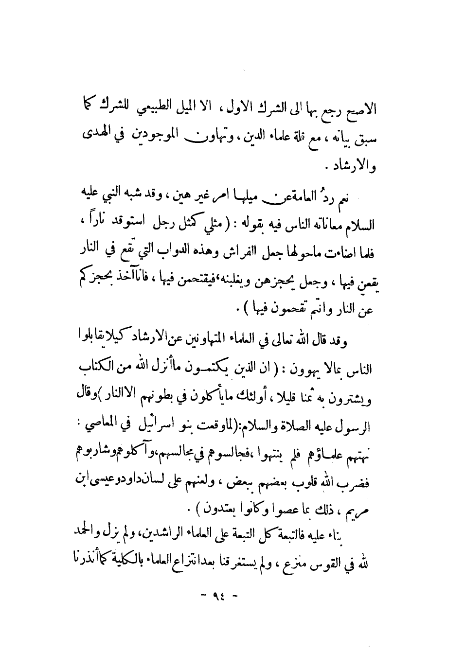 وَقد قَالَ الله تَعَالَى فِي الْعلمَاء المتهاونين عَن الْإِرْشَاد كَيْلا يقابلوا النَّاس بِمَا لَا يهوون: {إِن الَّذين يكتمون مَا أنزل الله من الْكتاب ويشترون بِهِ ثمنا قَلِيلا أُولَئِكَ مَا يَأْكُلُون فِي بطونهم إِلَّا النَّار} وَقَالَ الرَّسُول [صلى الله عَلَيْهِ وَسلم] : (لما وَقعت بَنو إِسْرَائِيل فِي الْمعاصِي: نهتهم علماؤهم فَلم ينْتَهوا، فجالسوهم فِي مجَالِسهمْ، وآكلوهم وشاربوهم فَضرب الله قُلُوب بَعضهم بِبَعْض، ولعنهم على لِسَان دَاوُد وَعِيسَى ابْن مَرْيَم، ذَلِك بِمَا عصوا وَكَانُوا يعتدون) .