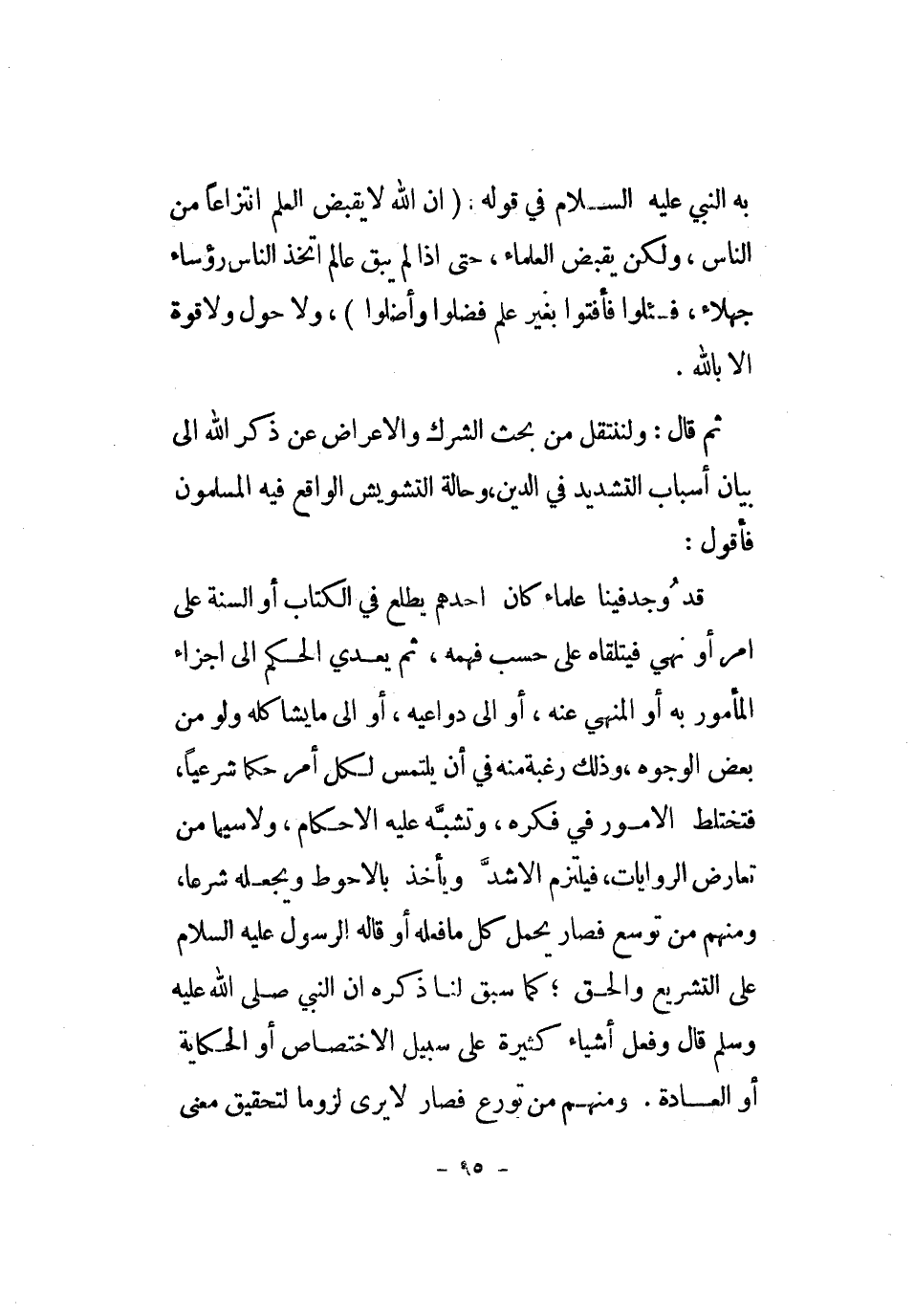 ثمَّ قَالَ: ولننتقل من بحث الشّرك والإعراض عَن ذكر الله إِلَى بَيَان أَسبَاب التَّشْدِيد فِي الدّين، وَحَالَة التشويش الْوَاقِع فِيهِ الْمُسلمُونَ فَأَقُول: