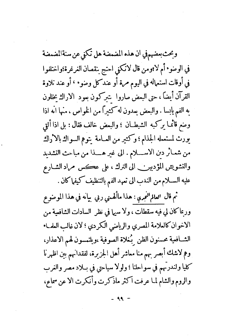وَبحث بَعضهم فِي أَن هَذِه الْمَضْمَضَة هَل تَكْفِي عَن سنة الْمَضْمَضَة فِي الْوضُوء أم لَا؟ وَمن قَالَ لَا تَكْفِي احْتج بِنُقْصَان الغرغرة؛ وَاخْتلفُوا فِي أَوْقَات اسْتِعْمَاله فِي الْيَوْم مرّة أَو عِنْد كل وضوء، أَو عِنْد تِلَاوَة الْقُرْآن أَيْضا، حَتَّى الْبَعْض صَارُوا يتبركون بِعُود الْأَرَاك يخللون بِهِ الْفَم يَابسا. وَالْبَعْض يعدون لَهُ كثيرا من الْخَواص، مِنْهَا إِنَّه إِذا وضع قَائِما يركبه الشَّيْطَان؛ وَالْبَعْض خَالف فَقَالَ: بل إِذا ألقِي يُورث لمستعمله الجذام؛ وَكثير من الْعَامَّة يتَوَهَّم السِّوَاك بالأراك من شَعَائِر دين الْإِسْلَام. إِلَى غير هَذَا من مبَاحث التَّشْدِيد والتشويش المؤديين إِلَى التّرْك، على عكس مُرَاد الشَّارِع عَلَيْهِ السَّلَام من النّدب إِلَى تعهد الْفَم بالتنظيف كَيْفَمَا كَانَ.
