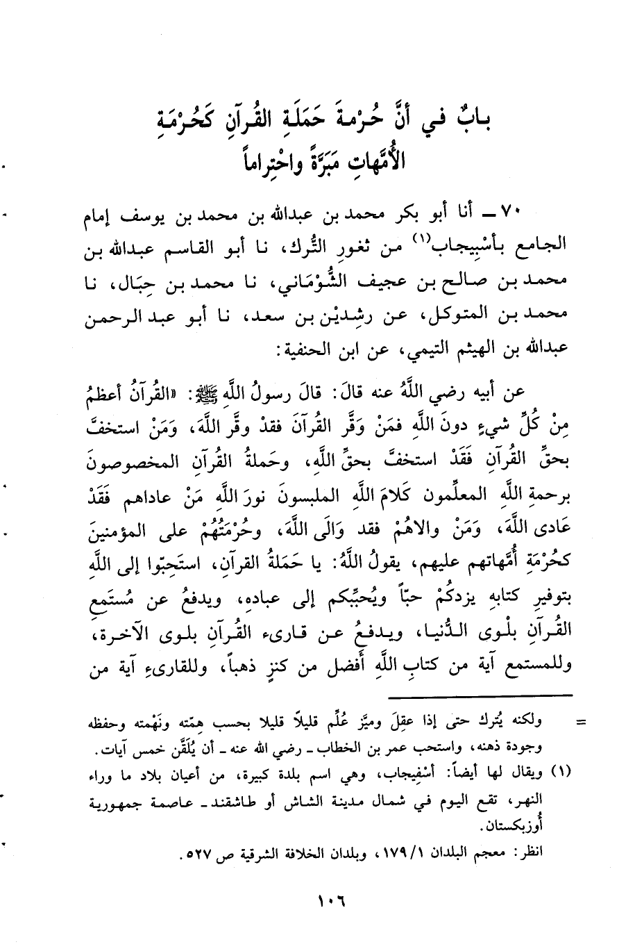 70 - أنا أَبُو بَكْرٍ مُحَمَّدُ بْنُ عَبْدِ اللَّهِ بْنِ مُحَمَّدِ بْنِ يُوسُفَ إِمَامُ الْجَامِعِ بِأَسْبِيجَابَ مِنْ ثُغُورِ التُّرْكِ، نا أَبُو الْقَاسِمِ عَبْدُ اللَّهِ بْنُ مُحَمَّدِ بْنِ صَالِحِ بْنِ عُجَيْفٍ الشُّومَانِيُّ، نا مُحَمَّدُ بْنُ حِبَالٍ، نا مُحَمَّدُ بْنُ الْمُتَوَكِّلِ، عَنْ رِشْدِينَ بْنِ سَعْدٍ، نا أَبُو عَبْدِ الرَّحْمَنِ عَبْدُ اللَّهِ بْنُ الْهَيْثَمِ التَّيْمِيُّ، عَنِ ابْنِ الْحَنَفِيَّةِ، عَنْ أَبِيهِ رَضِيَ اللَّهُ عَنْهُ، قَالَ: قَالَ رَسُولُ اللَّهِ صَلَّى اللَّهُ عَلَيْهِ وَسَلَّمَ: " §الْقُرْآنُ أَعْظَمُ مِنْ كُلِّ شَيْءٍ دُونَ اللَّهِ، فَمَنْ وَقَرَ الْقُرْآنَ فَقَدَ وَقَرَ اللَّهَ، وَمَنِ اسْتَخَفَّ بِحَقِّ الْقُرْآنِ فَقَدِ اسْتَخَفَّ بِحَقِّ اللَّهِ، وَحَمَلَةُ الْقُرْآنِ الْمَخْصُوصُونَ بِرَحْمَةِ اللَّهِ، الْمُعَلَّمُونَ كَلامَ اللَّهِ، الْمُلْبَسُونَ نُورَ اللَّهِ، مَنْ عَادَاهُمْ فَقَدْ عَادَى اللَّهَ، وَمَنْ وَالاهُمْ فَقَدْ وَالَى اللَّهَ، وَحُرْمَتُهُمْ عَلَى الْمُؤْمِنِينَ كَحُرْمَةِ أُمَّهَاتِهِمْ عَلَيْهِمْ، يَقُولُ اللَّهُ: يَا حَمَلَةَ الْقُرْآنِ، اسْتَحِبُّوا إِلَى اللَّهِ بِتَوْفِيرِ كِتَابِهِ يَزِدْكُمْ حُبًّا وَيُحْبِبْكُمْ إِلَى عِبَادِهِ، وَيَدْفَعْ عَنْ مُسْتَمِعِ الْقُرْآنِ بَلْوَى الدُّنْيَا، وَيَدْفَعْ عَنْ قَارِئِ الْقُرْآنِ بَلْوَى الآخِرَةِ، وَلَلْمُسْتَمِعُ آيَةً مِنْ كِتَابِ اللَّهِ أَفْضَلُ مِنْ كَنْزِ ذَهَباً، وَلَلْقَارِئُ آيَةً مِنْ