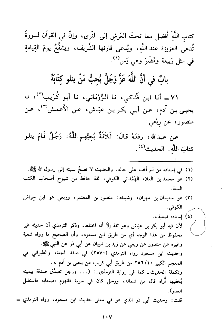 71 - أنا ابْنُ فناكي، نا الرُّويَانِيُّ، نا أَبُو كُرَيْبٍ، نا يَحْيَى بْنُ آدَمَ، عَنْ أَبِي بَكْرِ بْنِ عَيَّاشٍ، عَنِ الأَعْمَشِ، عَنْ مَنْصُورٍ، عَنْ رِبْعِيٍّ، عَنْ عَبْدِ اللَّهِ، رَفَعَهُ، قَالَ: " §ثَلاثَةٌ يُحِبُّهُمُ اللَّهُ: رَجُلٌ قَامَ يَتْلُو كِتَابَ اللَّهِ ".