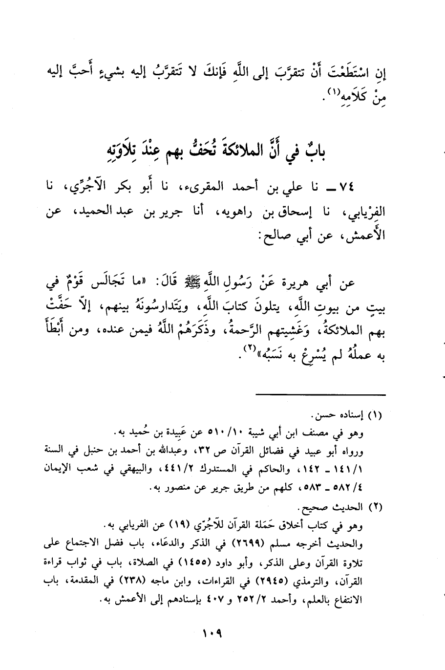 74 - نا عَليُّ بْنُ أَحْمَدَ الْمُقْرِئُ، نا أَبُو بَكْرٍ الآجُرِّيُّ، نا الْفِرْيَابِيُّ، نا إِسْحَاقُ بْنُ رَاهَوَيْهِ، أنا جَرِيرُ بْنُ عَبْدِ الْحَمِيدِ، عَنِ الأَعْمَشِ، عَنْ أَبِي صَالِحٍ، عَنْ أَبِي هُرَيْرَةَ، عَنْ رَسُولِ اللَّهِ صَلَّى اللَّهُ عَلَيْهِ وَسَلَّمَ، قَالَ: «§مَا تَجَالَسَ قَوْمٌ فِي بَيْتٍ مِنْ بُيُوتِ اللَّهِ، يَتْلُونَ كِتَابَ اللَّهِ، وَيَتَدَارَسُونَهُ بَيْنَهُمْ، إِلا حَفَّتْ بِهِمُ الْمَلائِكَةُ، وَغَشِيَتْهُمُ الرَّحْمَةُ، وَذَكَرَهُمُ اللَّهُ فِيمَنْ عِنْدَهُ، وَمَنْ أَبْطَأَ بِهِ عَمَلُهُ لَمْ يُسْرِعْ بِهِ نَسَبُهُ»